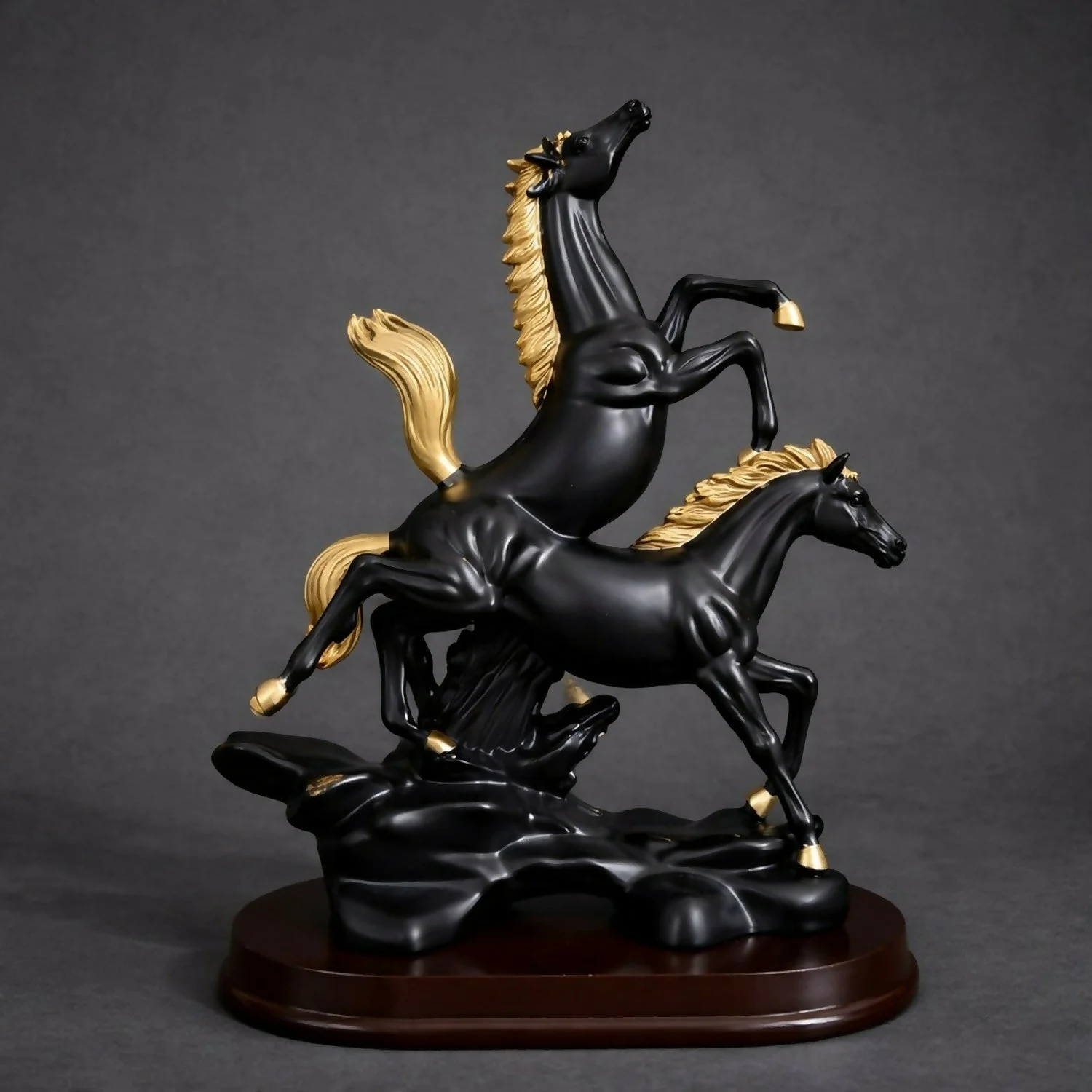 Enhance your home décor with this elegant dual horse showpiece crafted in a striking black and gold finish. Designed to symbolize strength, power, and success, this artistic figurine adds a luxurious touch to your living room, office desk, or display shelf. The detailed craftsmanship and premium finish make it a perfect centerpiece or a thoughtful gift for housewarming, festive occasions, or corporate gifting.