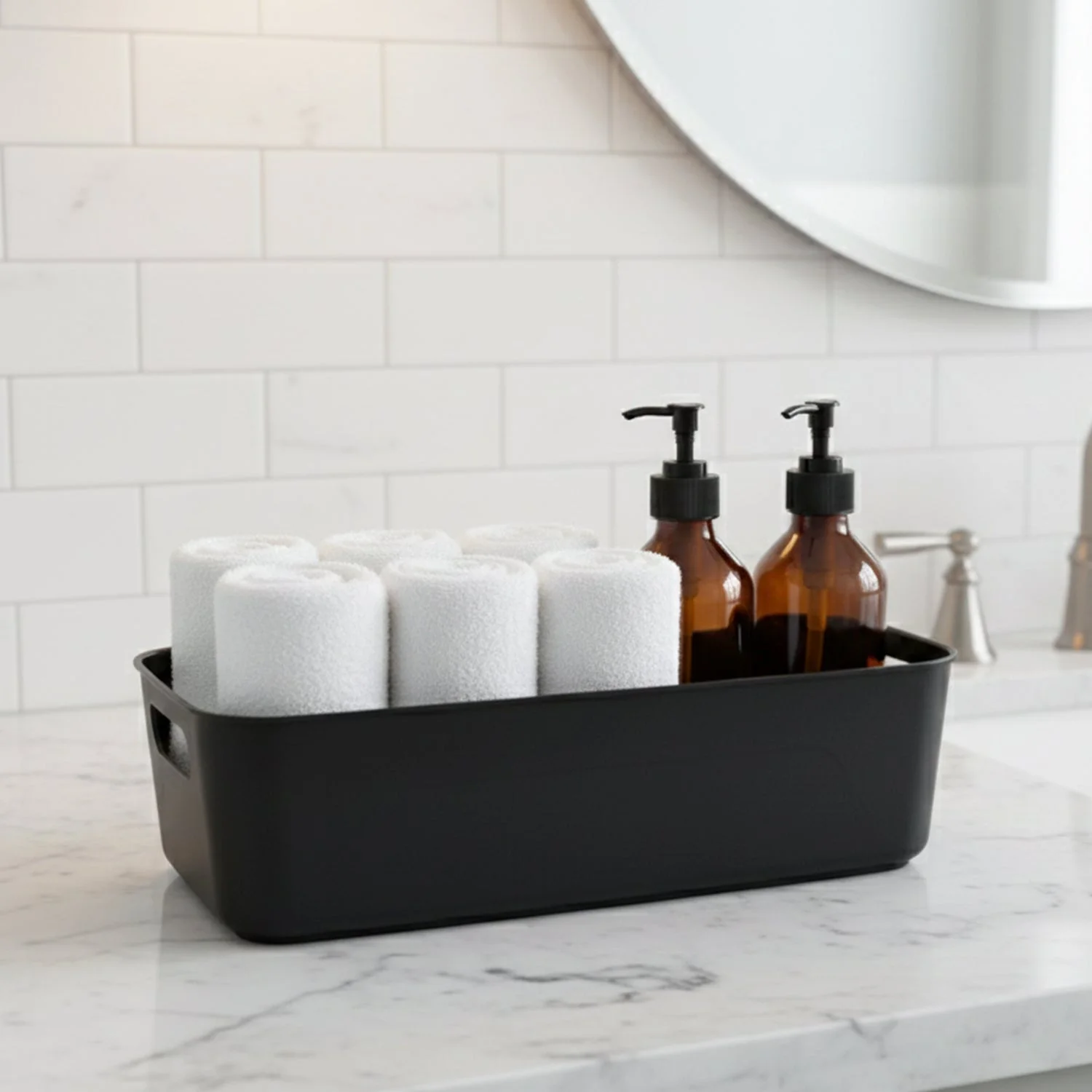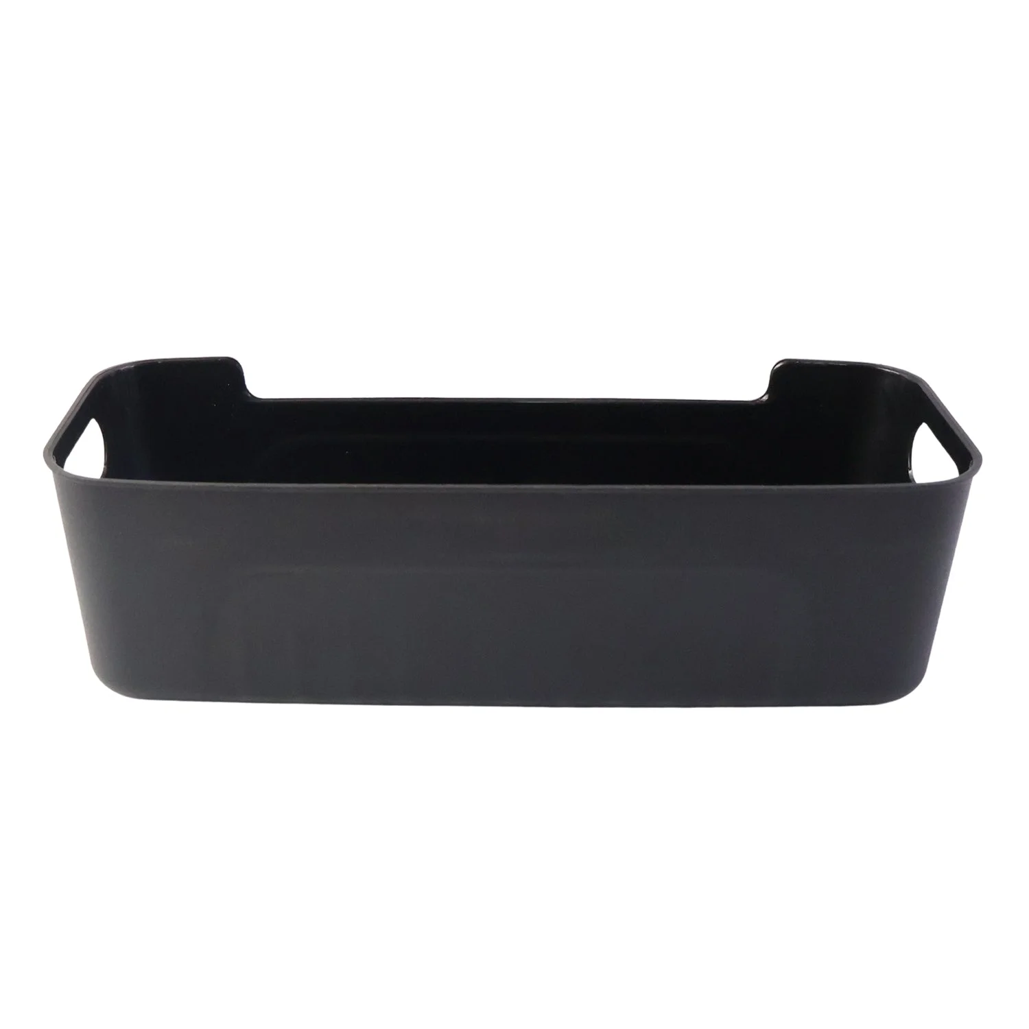 black storage basket, plastic storage basket, storage basket tray set, stackable storage basket, versatile storage organizer, multi-purpose storage bins, storage bins with handles, plastic organizer tray, stackable organizer basket,multipurpose storage tray, basket for organizing small items, storage basket for household, closet organizer basket
