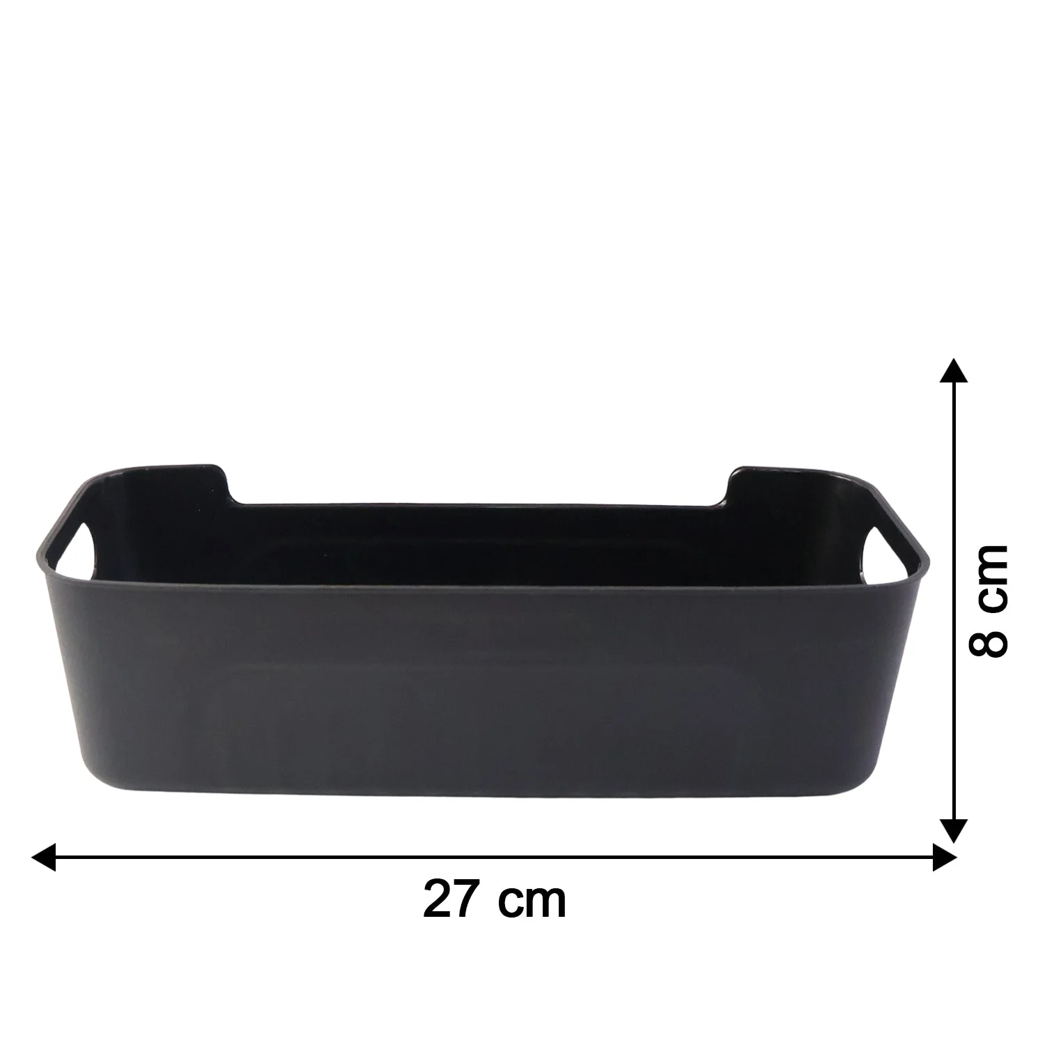 This Black Plastic Storage Basket Tray Set provides a simple, space-saving solution for organizing and storing items in your home, office, or kitchen. The set includes four sturdy baskets, each designed with built-in handles for easy handling and carrying. Perfect for organizing small items, stationery, kitchen utensils, toys, or household goods, these baskets help maximize space while keeping your space neat and tidy. The stackable design allows for compact storage, making them ideal for drawers, cabinets, or shelves.