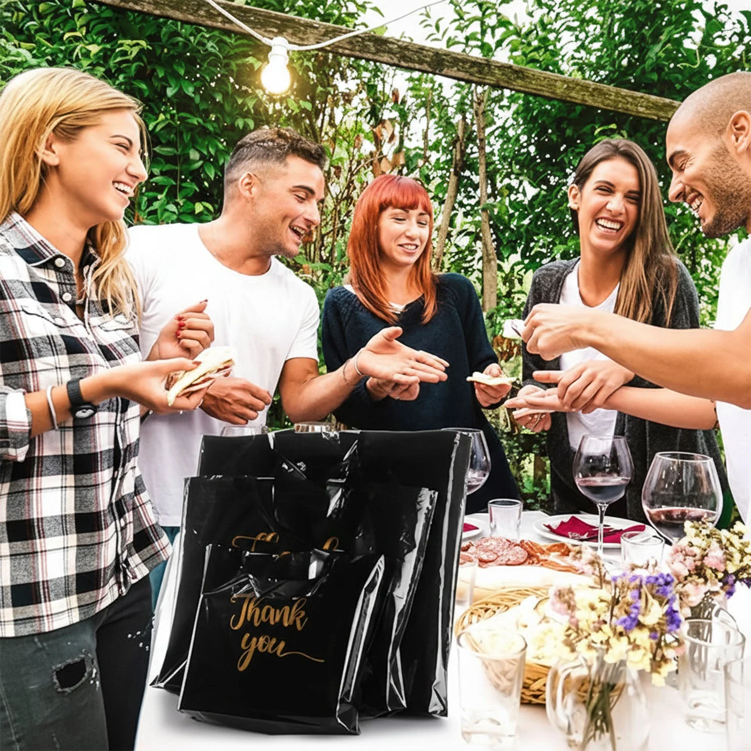 black thank you printed carry bags, set of 4 reusable carry bags, mix size shopping bags, strong handle tote bags, lightweight gift bags, takeaway carry bag set, retail use reusable bags, personal use shopping bags, eco friendly carry bags, printed tote bag set, multipurpose reusable bags, durable black shopping bags, grocery and gift tote bags