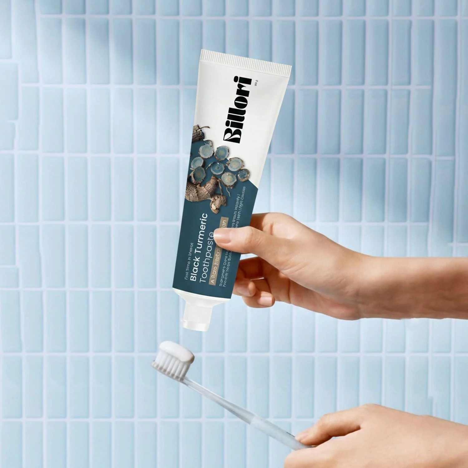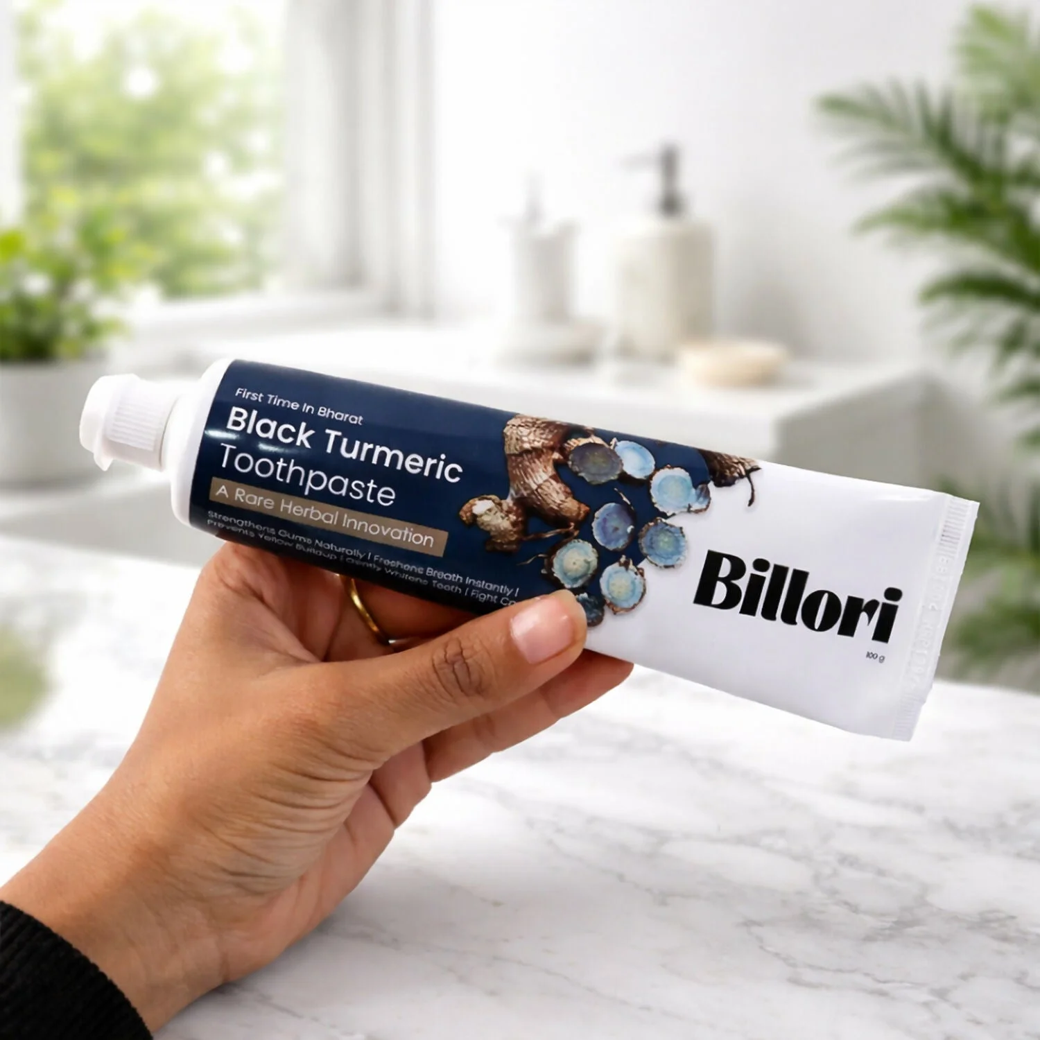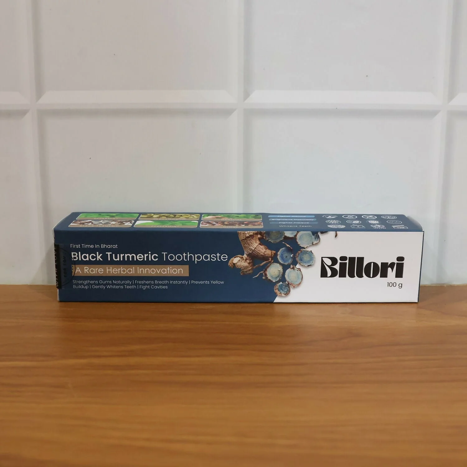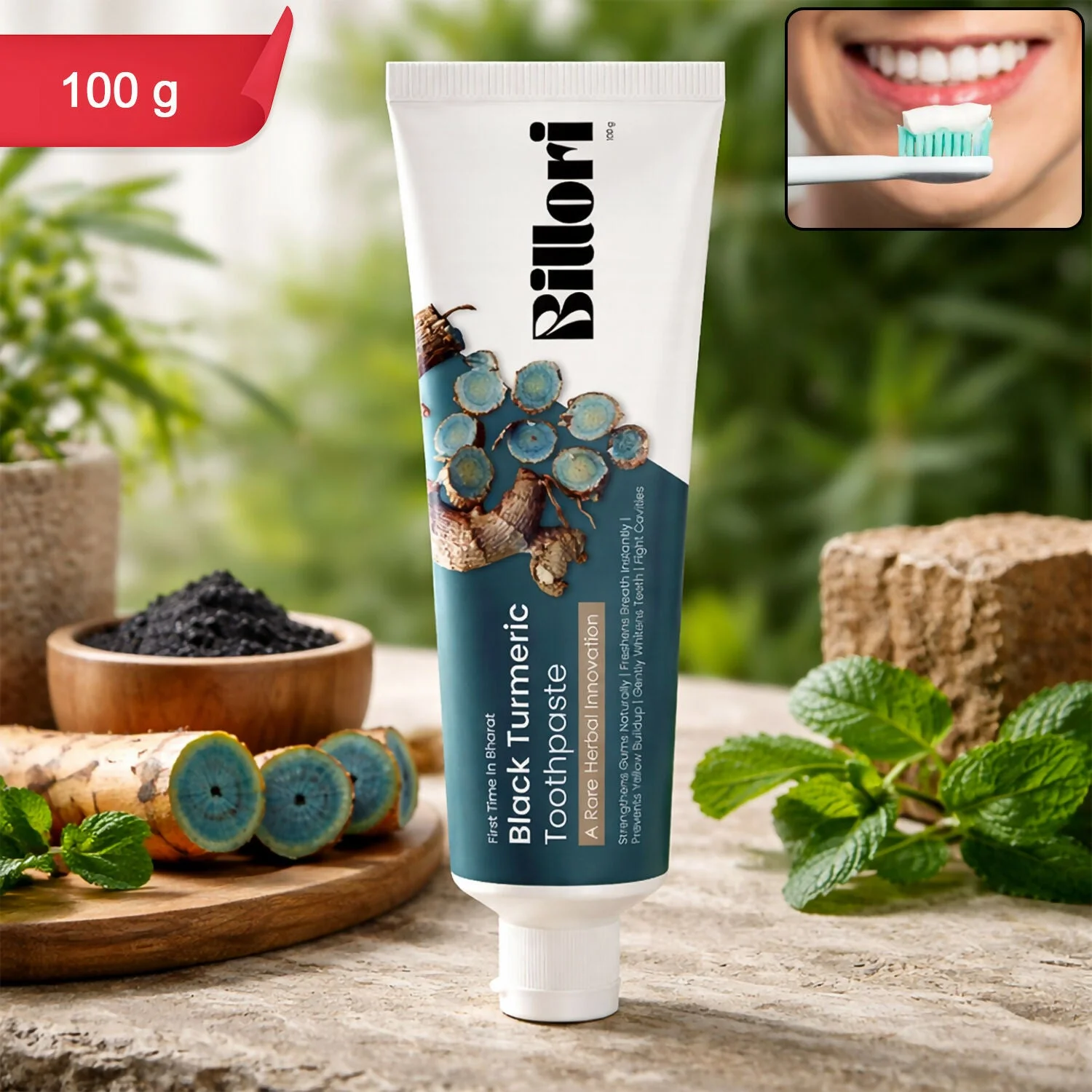 India’s first Billori Black Turmeric Toothpaste is an herbal blend crafted with Black Turmeric - a rare Ayurvedic herb known for its powerful antibacterial, anti-inflammatory, and healing properties. Enriched with herbs like Clove, Cardamom and Mint oils to keep your mouth clean and naturally protected. This natural formula helps strengthen gums, fight oral bacteria, and keep your breath fresh all day long. Free from fluoride, SLS, paraben and artificial colors — it’s your daily detox for a cleaner, healthier smile.