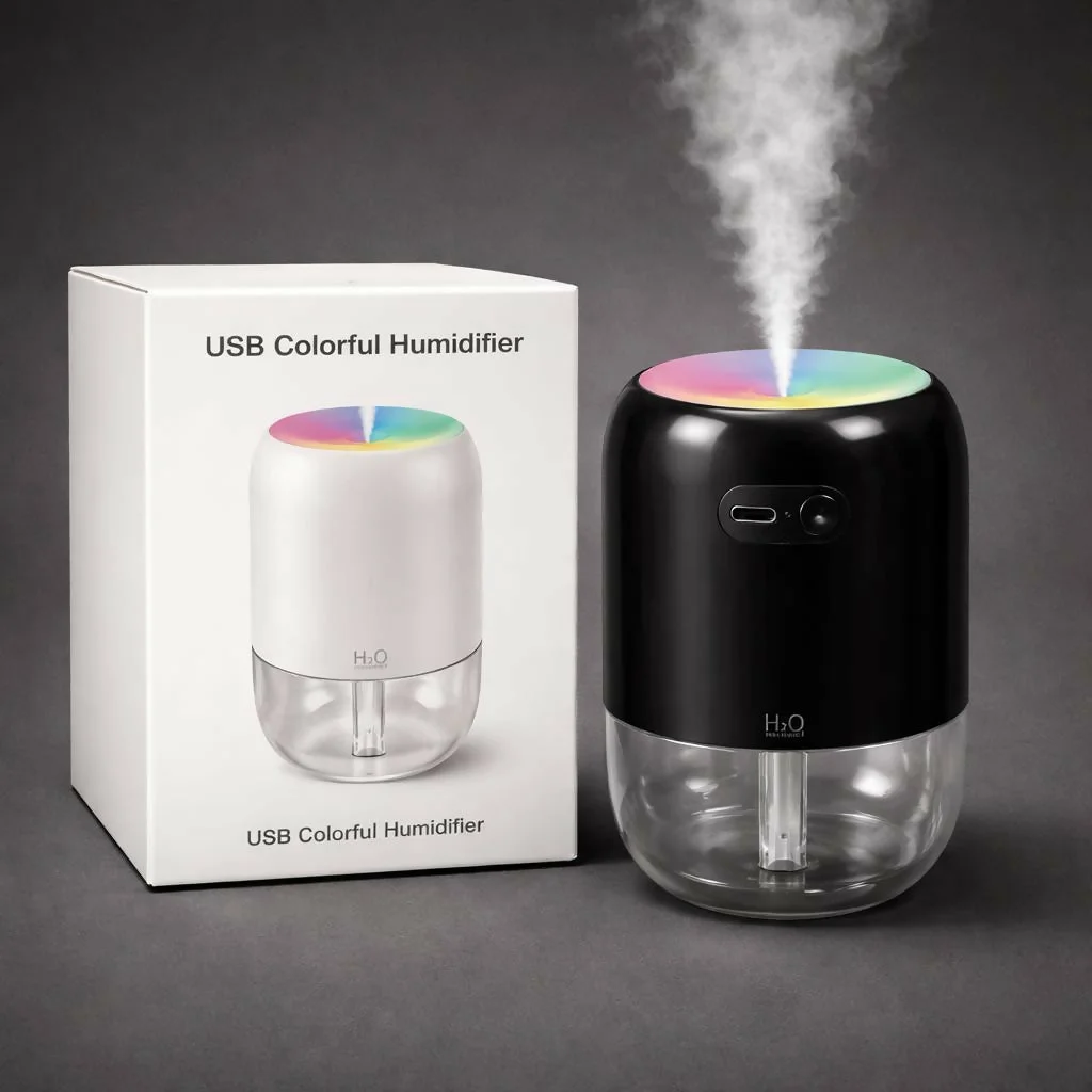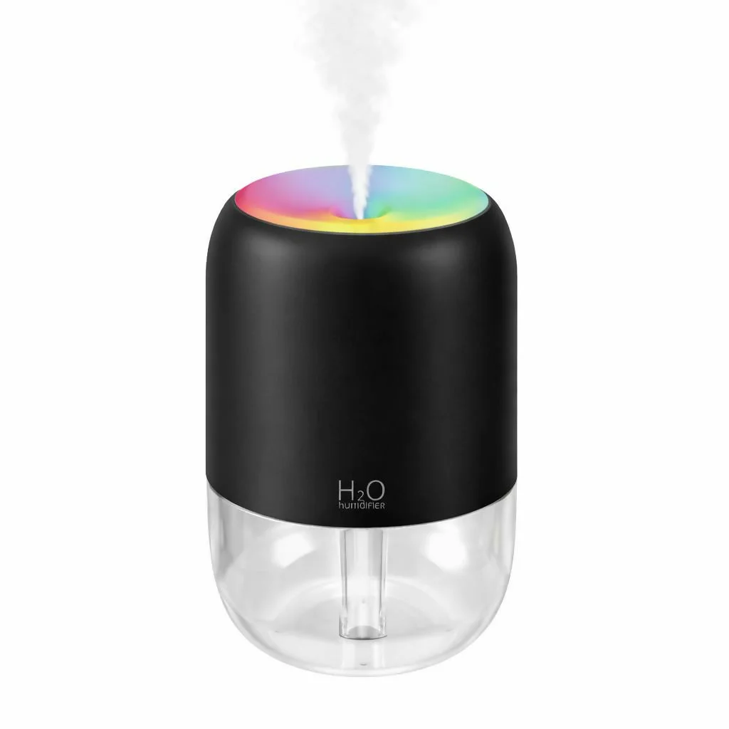 Improve the atmosphere of your home or workspace with this stylish H2O mini humidifier. Designed with a modern cylindrical shape and soft color-changing LED light, it adds both moisture and ambiance to any room. The compact humidifier releases a gentle mist to help maintain comfortable air moisture while creating a relaxing environment. Its transparent water tank allows easy monitoring of the water level, while the USB-powered design makes it convenient to use with laptops, power banks, or adapters. Perfect for bedrooms, offices, study desks, and small rooms, this humidifier combines functionality with modern décor.