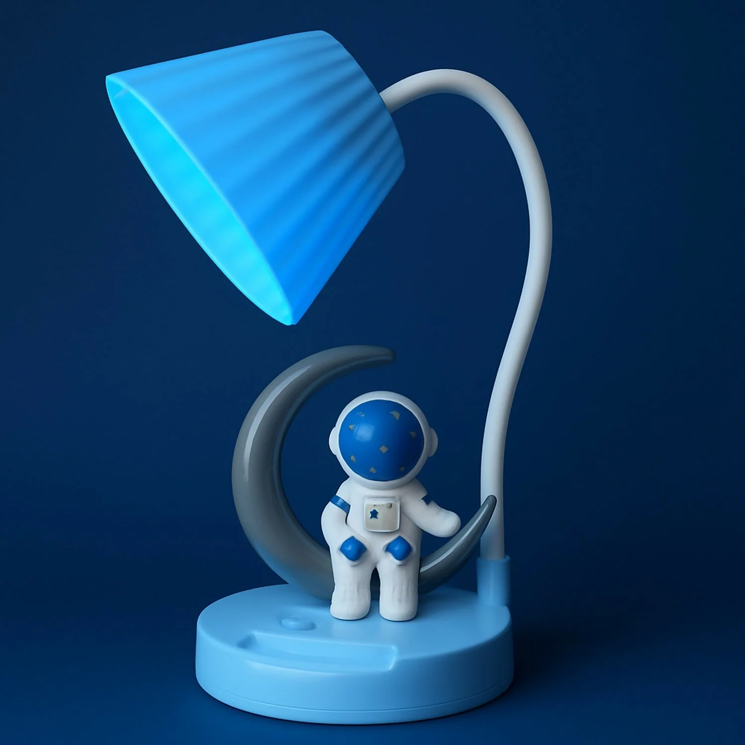 Create a calm and magical space vibe with this blue astronaut moon LED table lamp. Designed with a cute astronaut figurine sitting on a crescent moon and paired with a soft lampshade, it gives a warm, soothing glow that’s gentle on the eyes. Ideal for kids’ bedrooms, study tables, nurseries, and bedside use, the flexible neck allows easy light adjustment. Compact, decorative, and USB rechargeable, this lamp blends functionality with playful design and makes a perfect gift for kids and space lovers.