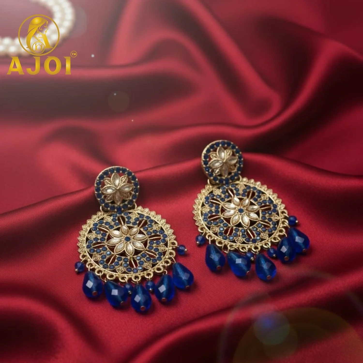 The centerpiece showcases a graceful floral motif highlighted with subtle stone embellishments, while the lower edge is adorned with shimmering royal blue teardrop beads that add fluid movement and luxurious appeal. Finished in a rich gold-tone polish, the combination of blue and gold creates a striking royal contrast perfect for grand occasions.