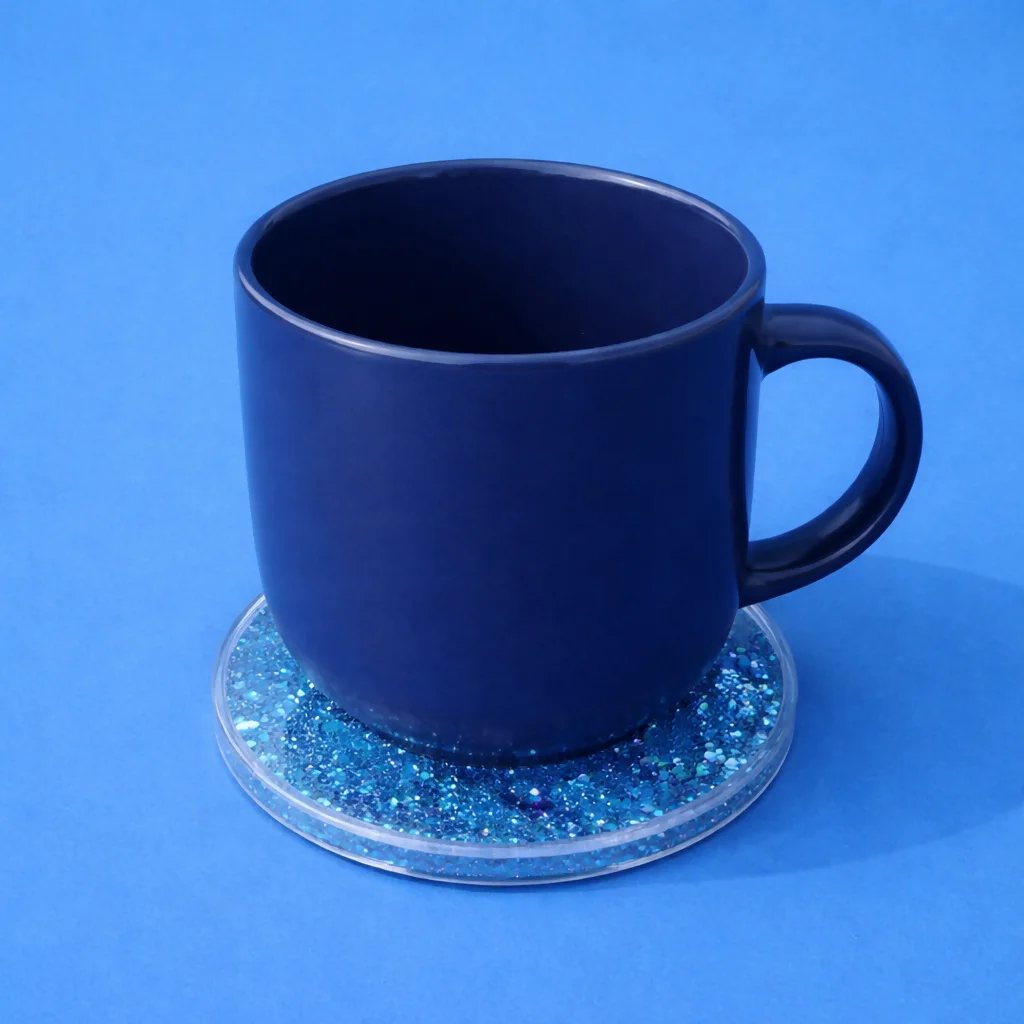 blue glitter tea coaster, resin cup coaster, coffee mug coaster, round table coaster, decorative tea coaster, drink coaster for table, heat resistant coaster, resin coaster for cups, sparkle coaster, kitchen table accessories