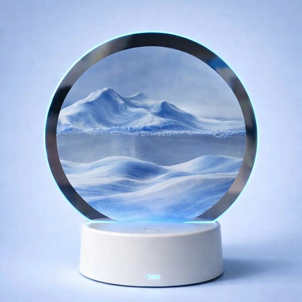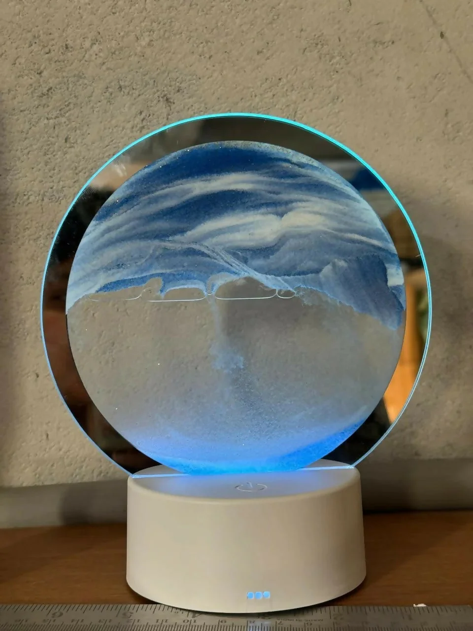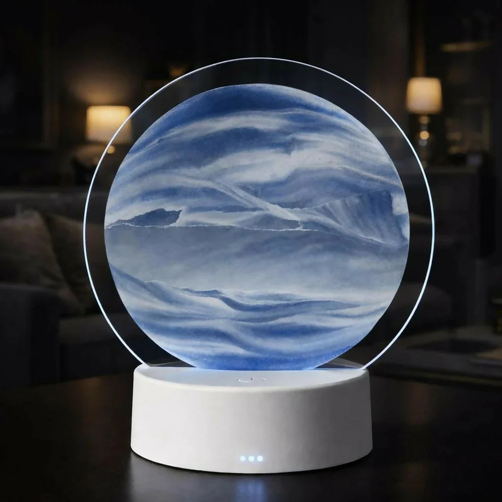 sand art lamp, moving sand lamp, LED decorative lamp, flowing sand art, ambient light lamp, desk lamp décor, relaxing lamp, bedside night light, modern home décor, office table lamp, unique gift lamp
