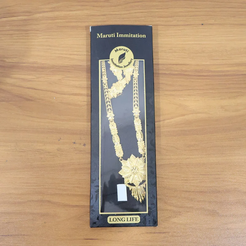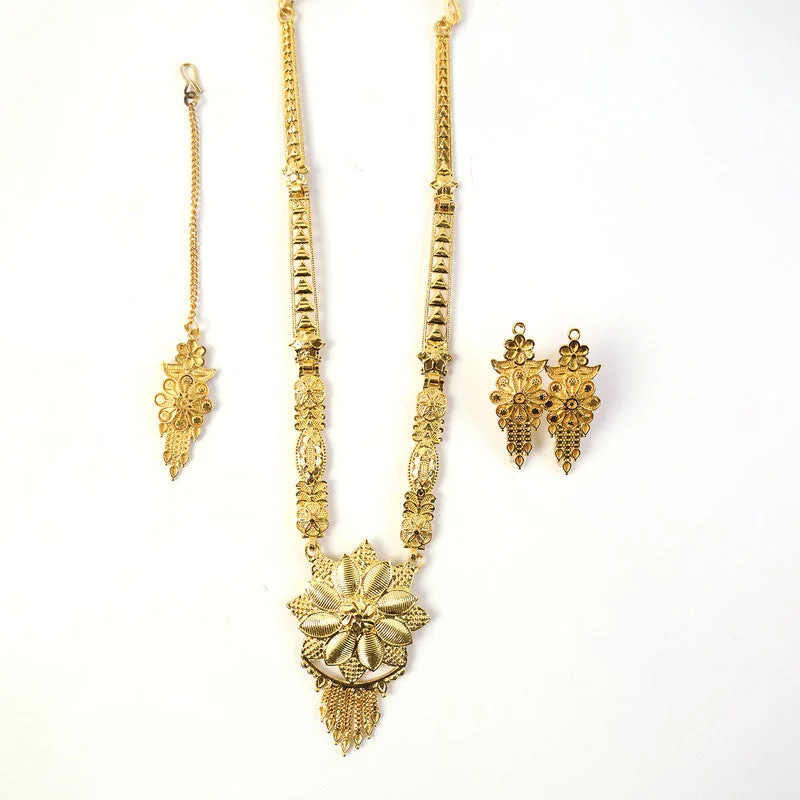 This stunning necklace set features a grand lotus-inspired pendant crafted with fine detailing, giving it a luxurious and trending bridal look. The long handcrafted chain showcases a mix of floral and geometric patterns, adding depth and elegance to the overall design. Paired with intricately carved earrings and a matching maang tikka, the set delivers a complete traditional ensemble perfect for weddings and festive occasions. Its rich craftsmanship, bold floral centerpiece, and premium finish make it a standout choice for modern brides and celebration wear. This trending design beautifully blends heritage artistry with contemporary appeal.