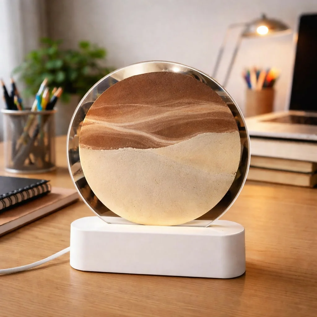 Enhance your space with this stunning moving sand art LED lamp that creates beautiful, ever-changing patterns. The circular acrylic design allows the sand to flow smoothly, forming unique landscape effects every time it is flipped. The warm LED lighting highlights the layered sand design, creating a cozy and relaxing atmosphere. Perfect for bedrooms, offices, or living rooms, this lamp is both a decorative showpiece and a calming visual experience.