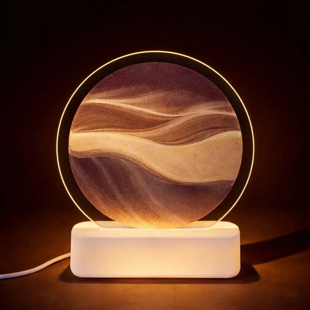 sand art lamp, moving sand lamp, LED decorative lamp, flowing sand art, ambient light lamp, desk lamp décor, relaxing lamp, bedside night light, modern home décor, office table lamp, unique gift lamp