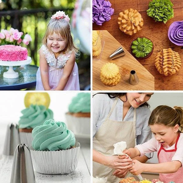 With a set of different pattern cake tips which you can create all types of beautiful patterns on cake, cupcakes, pie and biscuit.