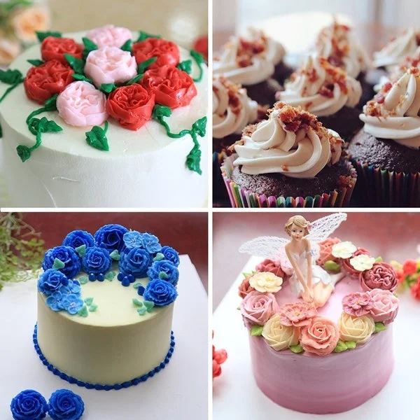 With a set of different pattern cake tips which you can create all types of beautiful patterns on cake, cupcakes, pie and biscuit.