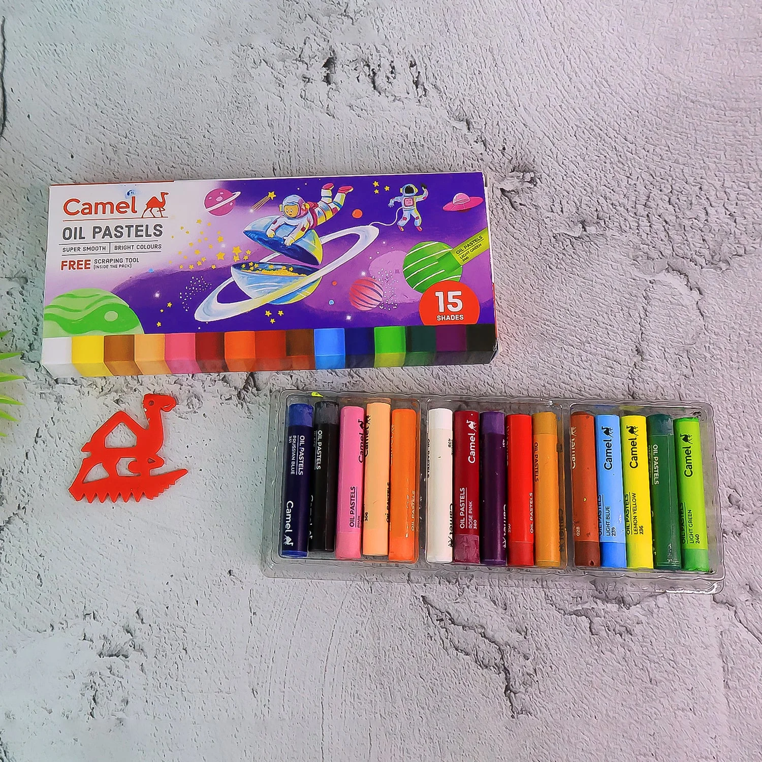 Camel Oil Pastels are specially crafted to provide smooth, vibrant, and long-lasting colours for artistic creations. With 15 assorted shades, these pastels deliver rich pigmentation and easy blending, allowing artists and students to create striking effects. The soft texture ensures effortless application on paper and board, while the included free scraping tool helps explore advanced techniques like scraffito and layering. These oil pastels are non-toxic and safe for children, making them a trusted choice for both beginners and professionals.