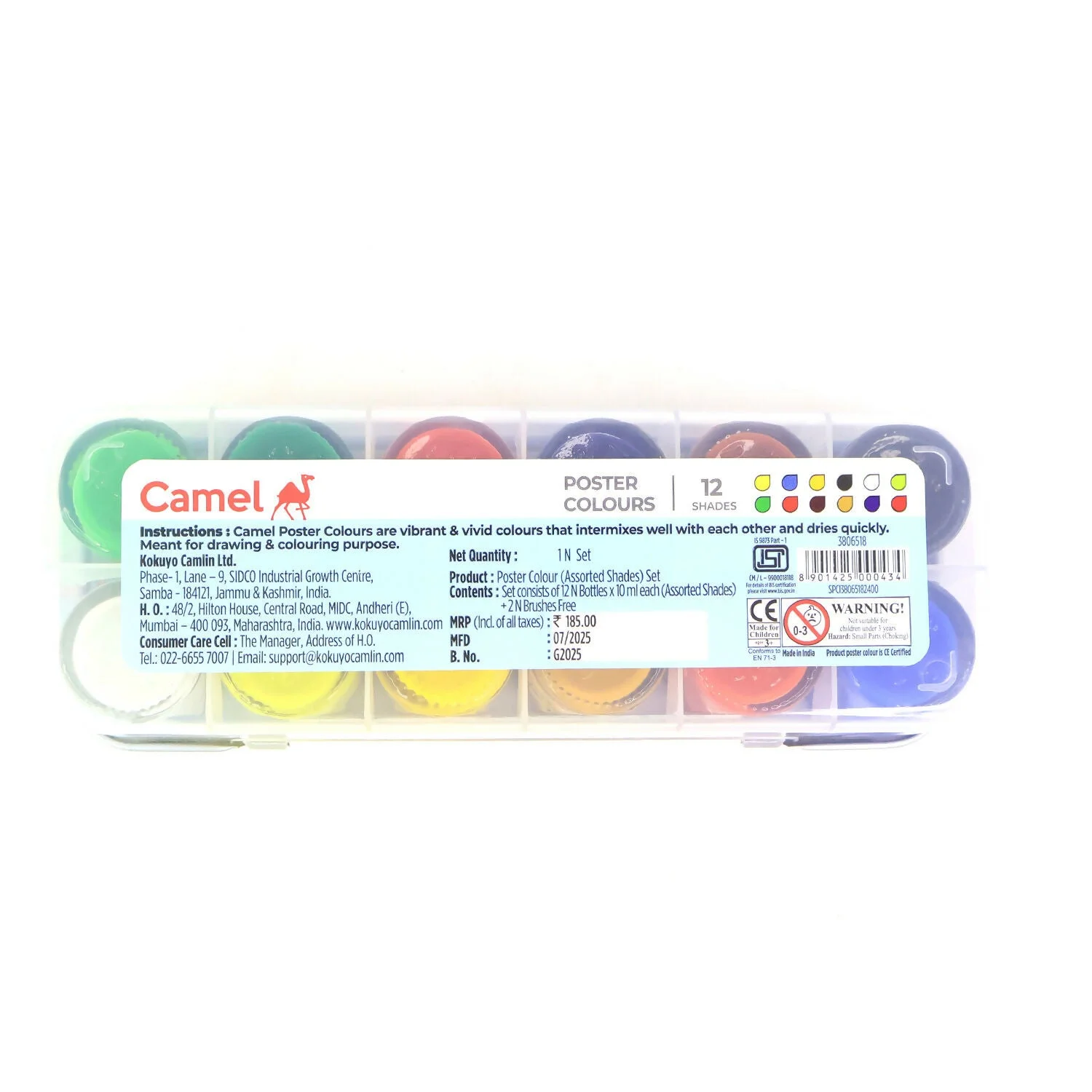 Camel Poster Colours are designed for students, hobbyists, and budding artists, providing rich opacity, vibrant tones, and smooth colour flow. This 12-shade pack comes in compact 10 ml bottles, making it convenient for use in schools, colleges, and art projects. The colours blend easily, dry to a smooth matte finish, and are ideal for poster-making, craftwork, and classroom assignments. Packaged in a durable box, it ensures easy storage and organized use.