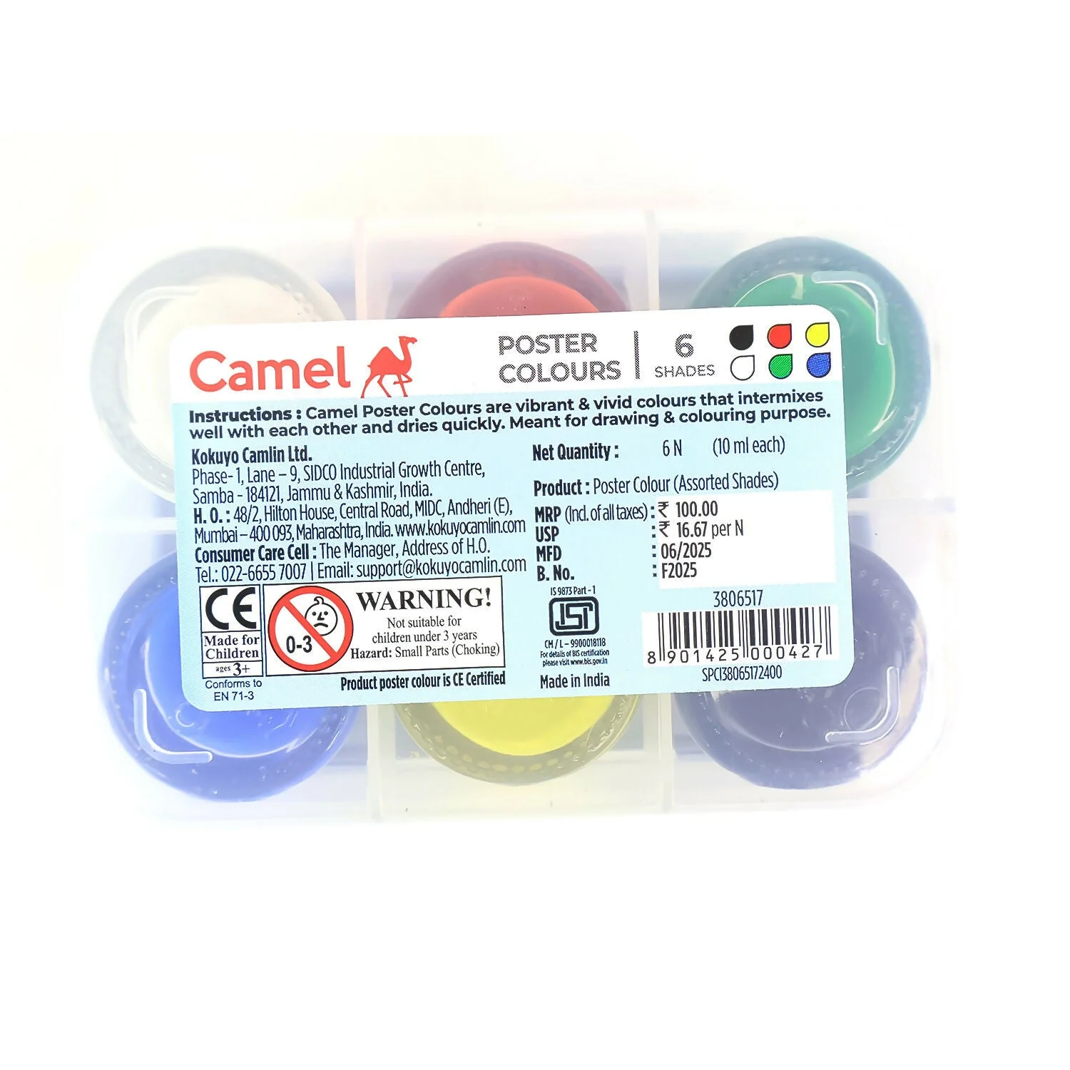 Camel Poster Colours by Kokuyo Camlin are formulated to deliver rich, opaque, and vibrant shades with a smooth flow, making them perfect for school projects, art assignments, and creative painting. This 6-shade pack contains the most essential colours for beginners and young artists, packed in easy-to-use 10 ml bottles. The set also comes with a free mixing palette, making it convenient to blend shades and explore creativity.