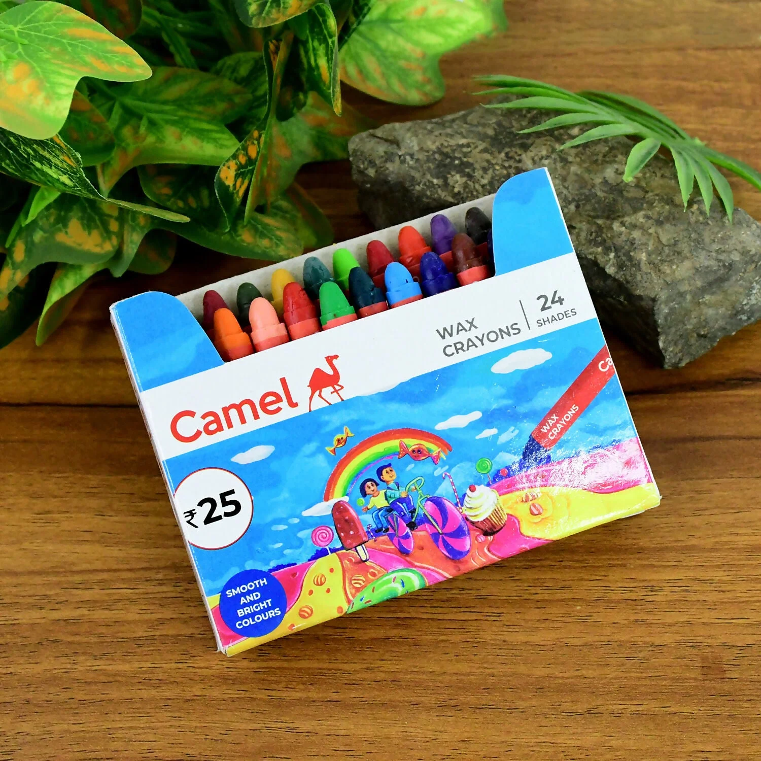 Camel Wax Crayons – 24 Vibrant Shades Smooth Colouring Set for Kids, Students, and Hobby Artists with Free Scraper