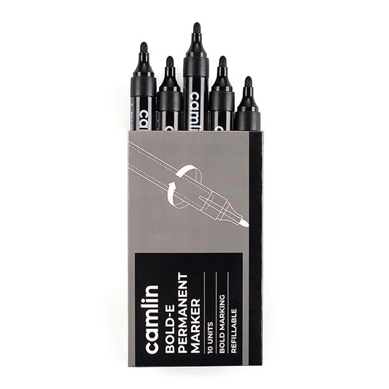 The Camlin Bold-E Permanent Marker Black Pack of 10 is specially designed for bold and durable marking on multiple surfaces including paper, cardboard, plastic, glass, metal, and wood, making it ideal for industrial, office, school, and home use. With its intense black ink, this marker ensures clear, long-lasting, and smudge-resistant writing that stands out on all surfaces. The refillable design allows extended usage while reducing waste, and the durable tip ensures smooth ink flow with consistent performance. Easy to hold and designed for everyday practicality, these markers are perfect for labeling, packaging, presentations, or creative projects where visibility and permanence are key.