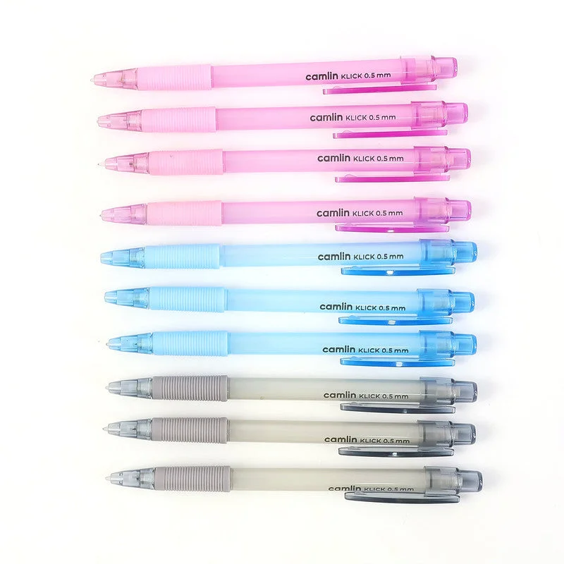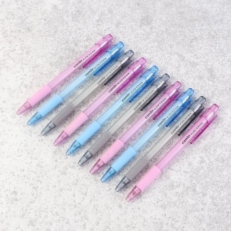 camlin klick 0.5 mm mechanical pencil, camlin mechanical pencil, 0.5 mm pencil, smooth writing mechanical pencil, soft ribbed grip pencil, camlin pencil pack of 10, pink blue grey pencils, school mechanical pencil, office mechanical pencil, camlin stationery,camlin writing instruments, refillable mechanical pencil, camlin click pencil