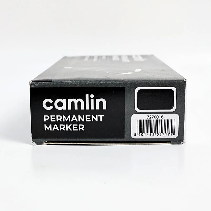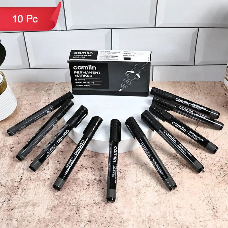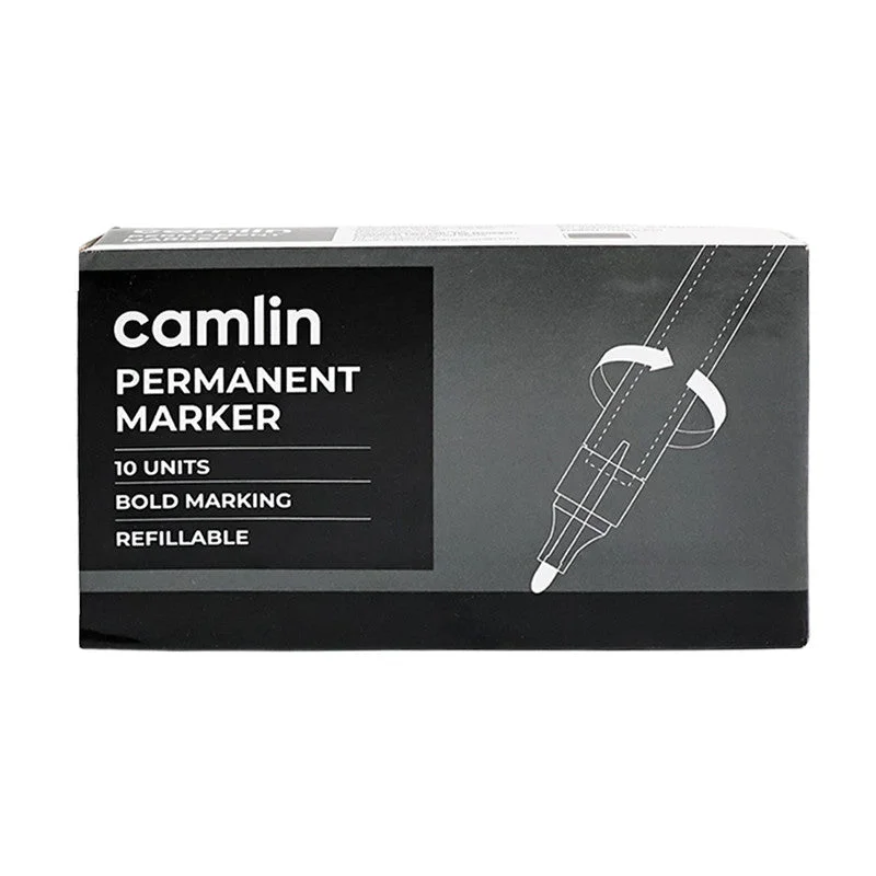 The Camlin Permanent Marker Black Pack of 10 is designed for bold and durable marking on a wide range of surfaces including paper, cardboard, plastic, glass, wood, and metal, making it a versatile choice for offices, schools, warehouses, and home use. Its rich black ink delivers clear, smudge-resistant, and long-lasting results, ensuring high visibility and permanence. The refillable design offers extended usability while reducing waste, and the durable fiber tip ensures consistent ink flow for smooth writing and marking. Comfortable to hold and easy to use, this set of 10 Camlin Permanent Markers is ideal for labeling, packaging, signage, and creative projects that require reliable and permanent marking.