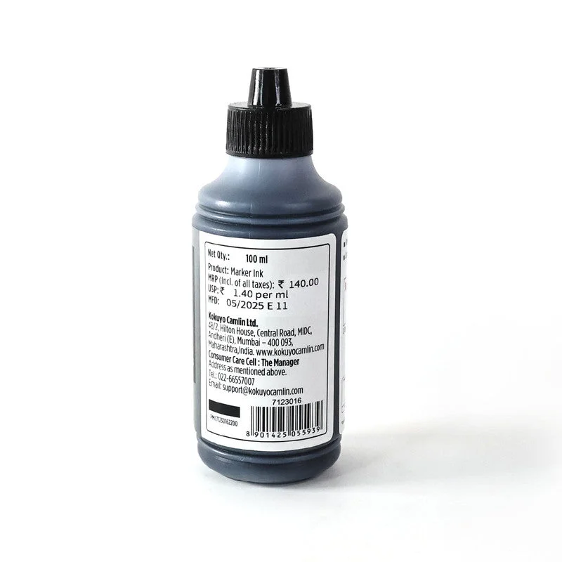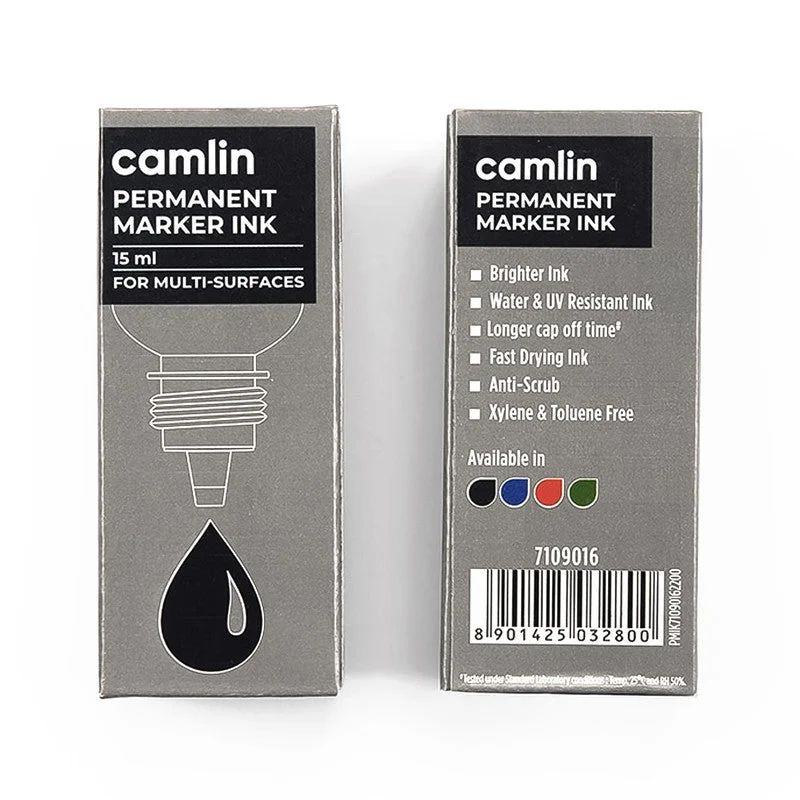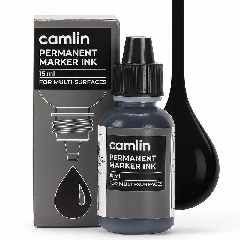 The Camlin Permanent Marker Ink 15 ml in Black color is a premium refill solution designed to revive and extend the life of your permanent markers while ensuring rich, bold, and long-lasting results on multiple surfaces. Crafted with deep black pigmentation, this ink delivers strong visibility and professional quality impressions that do not fade easily. Its smooth-flowing formula is quick-drying, smudge-resistant, and water-resistant, making it ideal for use on diverse materials such as paper, cardboard, glass, plastic, wood, and metal. Perfect for both professional and everyday needs, it ensures clear labeling, sharp markings, and neat finishes whether in offices, schools, creative projects, or industrial applications. The easy-to-use dropper bottle ensures a clean and hassle-free refilling process, preventing ink wastage and allowing precise application. Compact, reliable, and efficient, this 15 ml Black Permanent Marker Ink is an essential tool for maintaining productivity, creativity, and durability in your work.