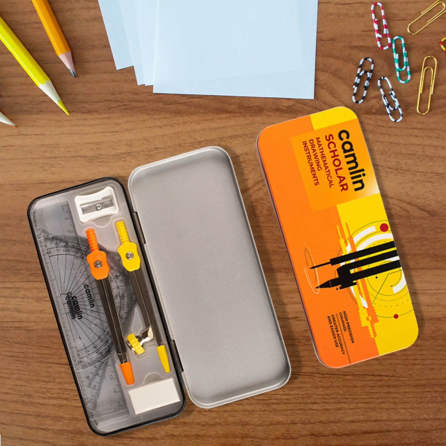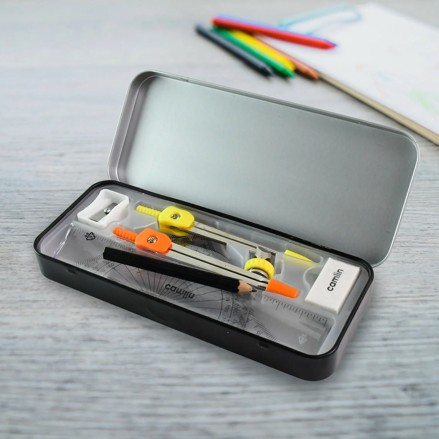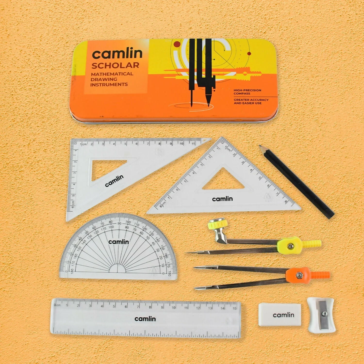 The Camlin Scholar Mathematical Drawing Instruments Box is a premium quality geometry set designed for precision, durability, and ease of use. This complete kit includes all essential tools required for mathematics, engineering drawing, geometry, and technical drawing tasks. Each instrument is crafted with high accuracy to ensure clean lines and exact measurements, making it ideal for students, architects, and professionals alike. The set comes in a sturdy metal box that ensures long-lasting protection and easy portability.
