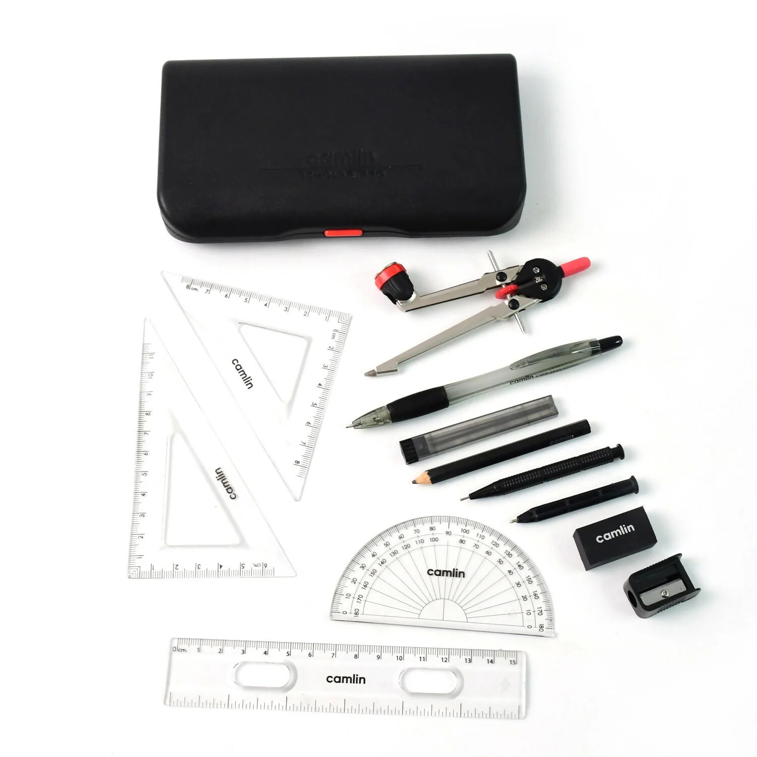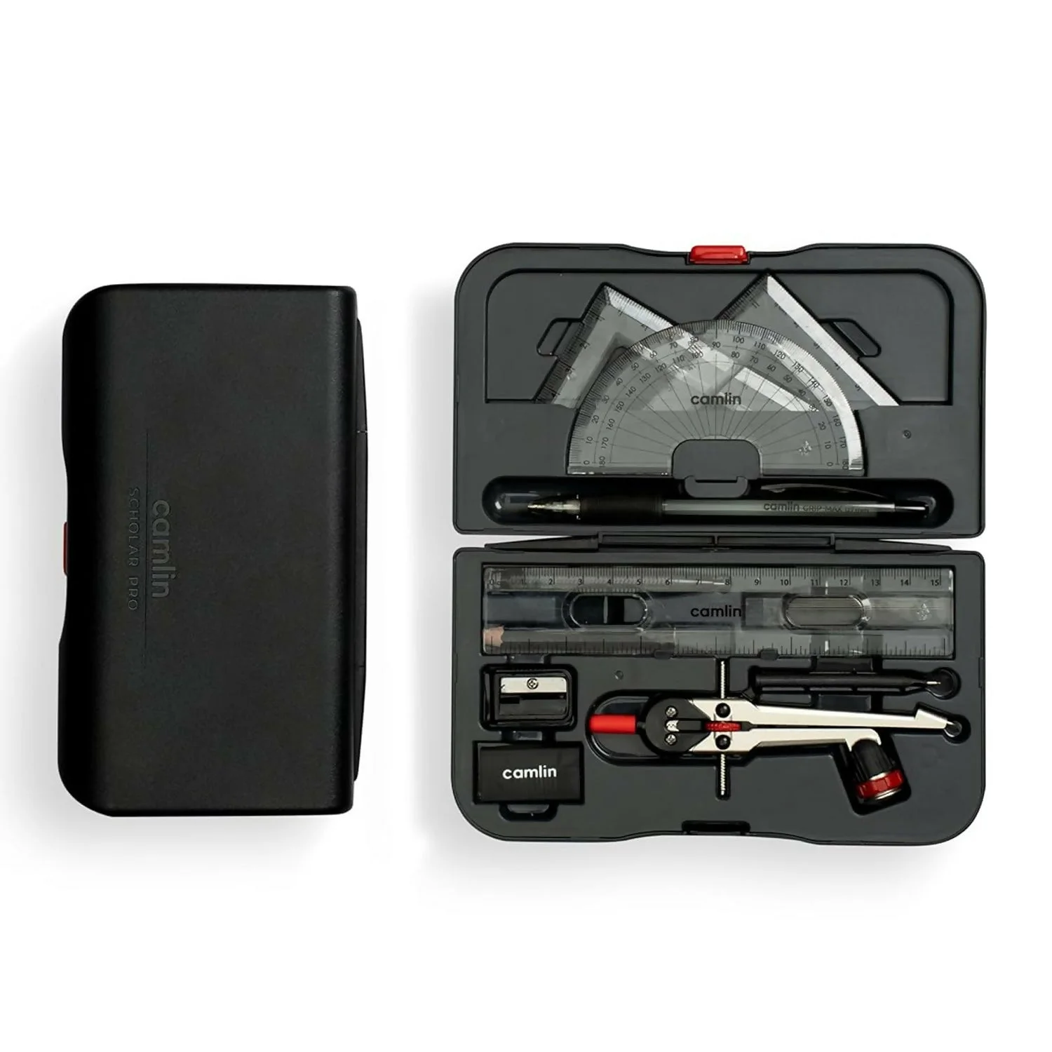 The Camlin Scholar Pro Geometry Box is a premium set of mathematical drawing instruments designed for accuracy, durability, and ease of use. It comes with high-quality tools like a self-centering compass, set squares, protractor, scale, divider, pencils, eraser, and sharpener, all neatly organized in a sturdy case. With smooth precision and a compact design, this box is perfect for students, architects, engineers, and professionals who need reliable instruments for geometry, technical drawing, and creative work.