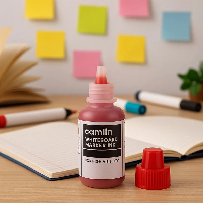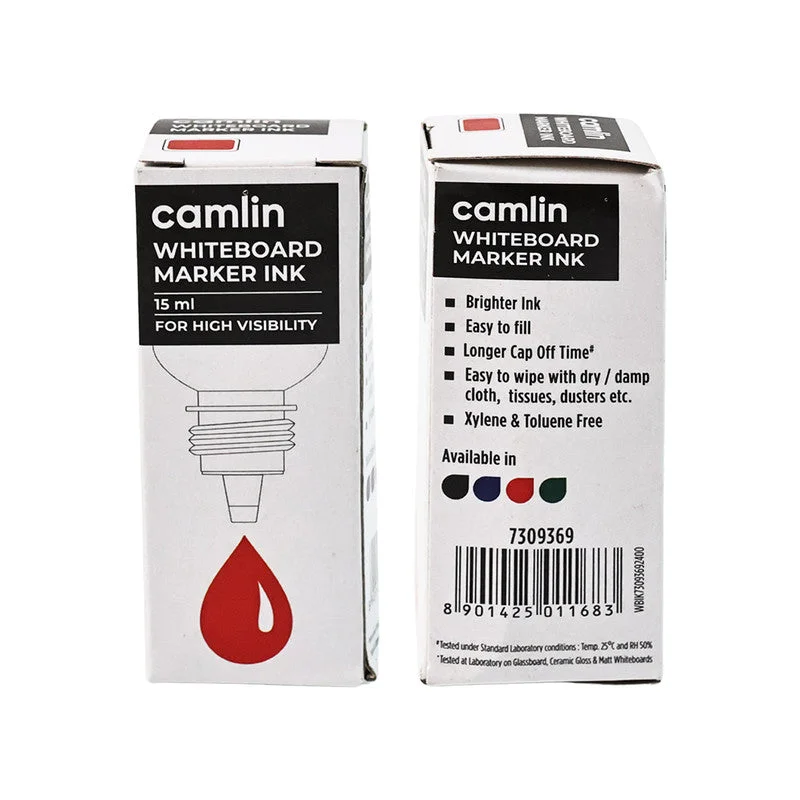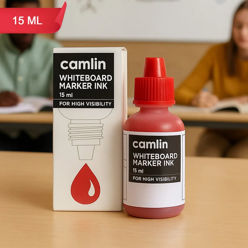 The Camlin Whiteboard Marker Ink 15 ml in Red color is a high-visibility refill solution that ensures bold, clear, and vibrant writing on whiteboards. Specially formulated with smooth-flowing ink, it dries quickly, resists smudging, and erases cleanly without leaving stains or ghost marks. The compact 15 ml bottle is designed with a convenient nozzle for easy and mess-free refilling, reducing wastage and keeping your markers ready for consistent use. With its striking red pigmentation, this ink is perfect for highlighting important points, teaching, office work, and creative presentations. Compact, reliable, and professional, the Camlin Red Whiteboard Marker Ink is an essential choice for classrooms, offices, training sessions, and everyday professional needs.