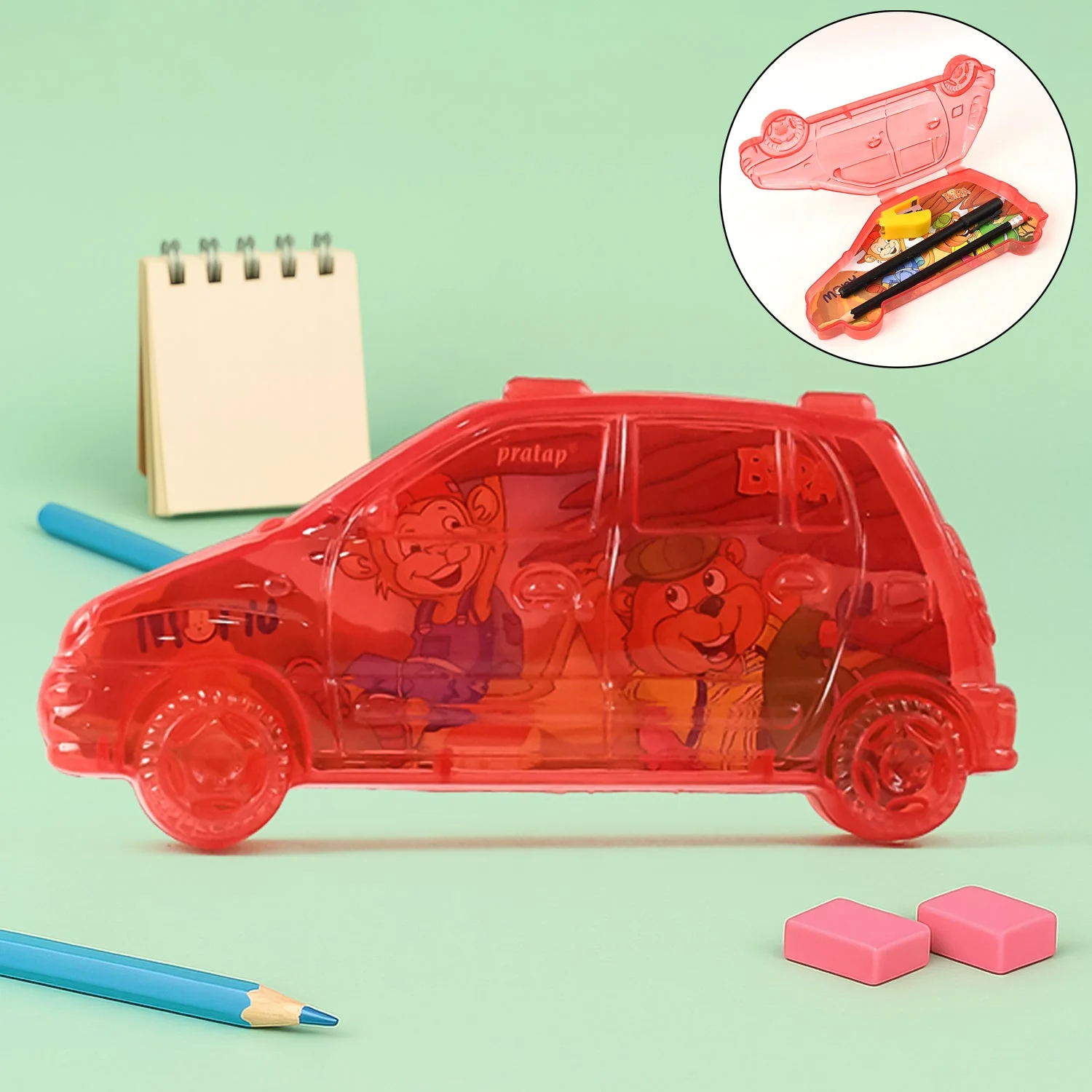 Crafted from durable, child-safe plastic, it features a spacious interior for storing pencils, erasers, sharpeners, pens, and other stationery items. Its compact size fits easily into school bags, while the smooth rounded structure and car detailing make it both eye-catching and functional. A perfect gift for birthdays, return gifts, or everyday school use.