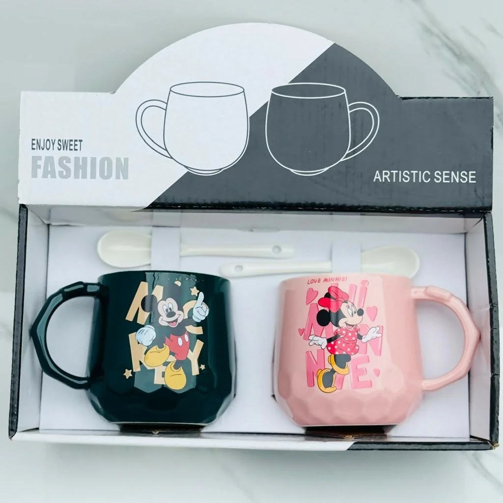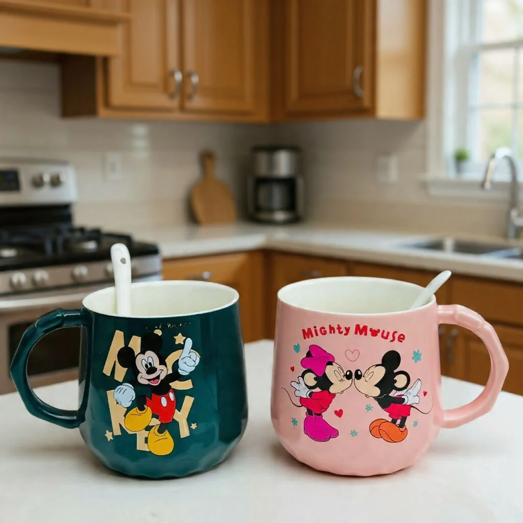 ceramic mug set of 2, couple mugs, cartoon mug set, coffee mug set with spoon, tea cup set, gift mug set, cute mugs, printed mugs, couple gift set, beverage cups, kitchen mugs, decorative mugs, office mug set, daily use cups