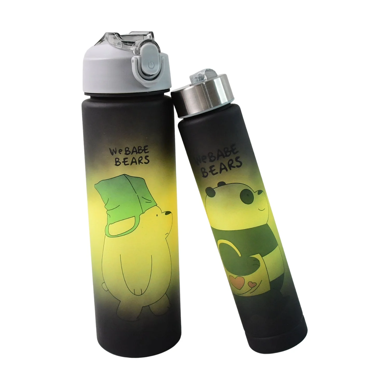 This attractive set of 2 cartoon-printed water bottles is designed to make hydration fun and stylish. Featuring a unique "We Babe Bears" theme, the set includes a large 900 ml bottle and a compact 300 ml bottle, catering to both heavy and light usage needs. The bottles are made from durable, lightweight material with a matte finish and playful printed designs that appeal to kids, students, and young adults. The secure flip-top cap and leak-proof design make them perfect for carrying in bags without any worry of spills. Ideal for everyday use at school, office, gym, or while traveling, these bottles combine convenience, safety, and fun in one package.