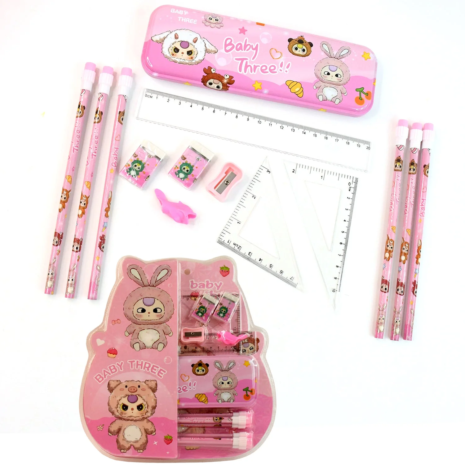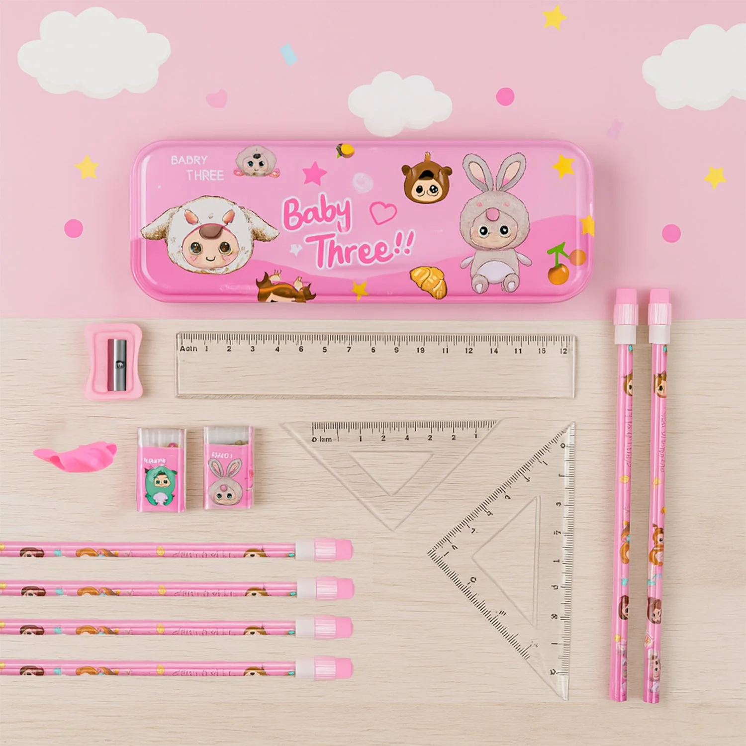 Cartoon Stationery Gift Set for Kids – Includes Metal Pencil Box, 6 Pencils, 2 Erasers, Sharpener, Ruler, 2 Square & More – Ideal School Supply Combo for Boys & Girls (14 Pc)