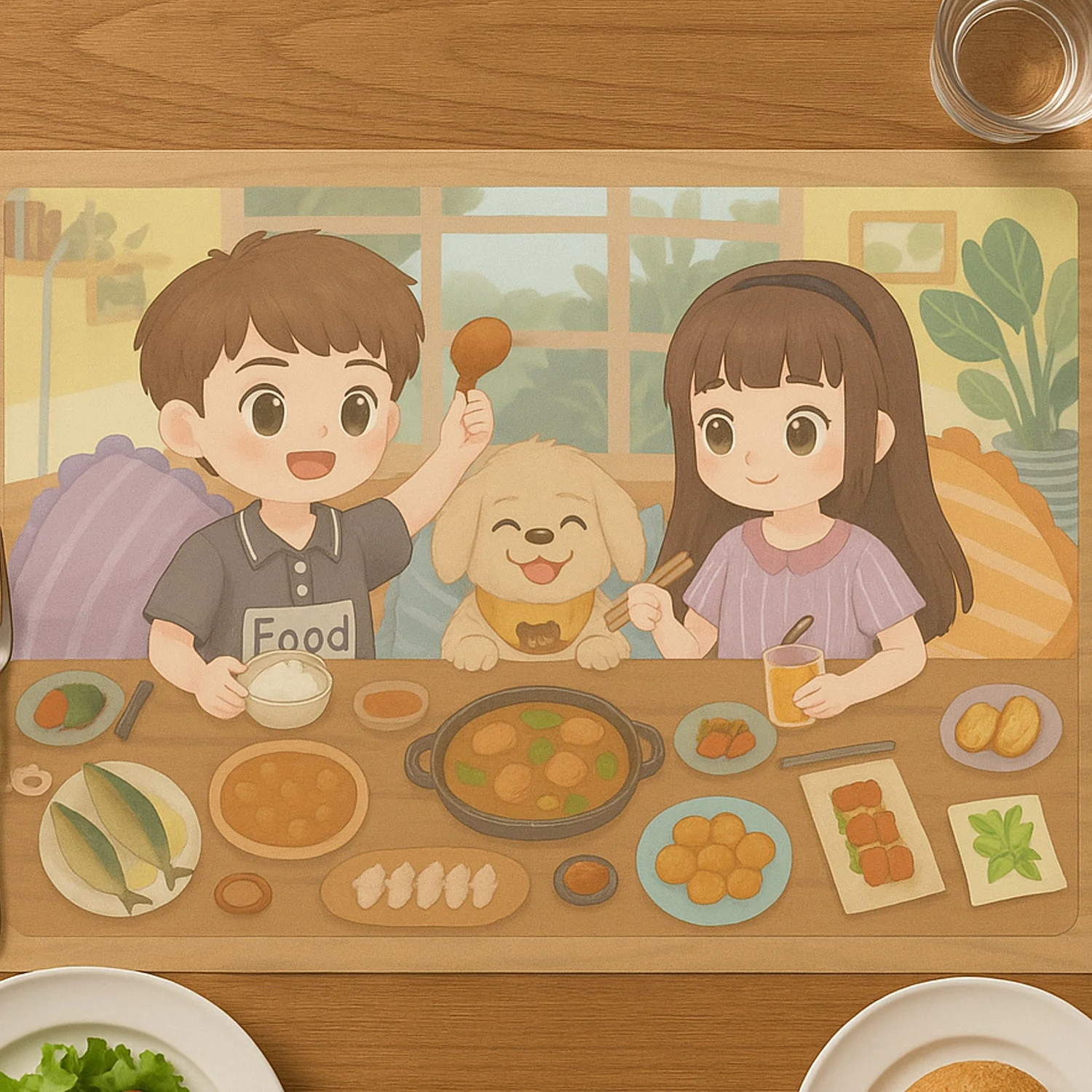 Fun and colorful cartoon food scene featuring two kids and a dog