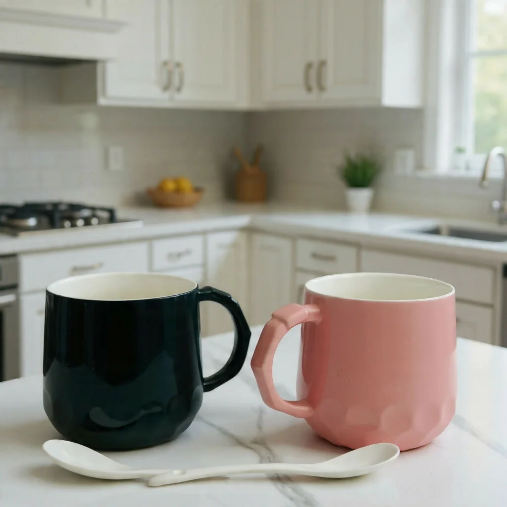 Upgrade your drinkware collection with this stylish ceramic mug set of 2. Featuring a modern textured design and elegant gold-style print, these mugs add a premium touch to your coffee or tea time. Each mug comes with a matching spoon, making it convenient for stirring your favorite beverages. Perfect for home, office, or gifting, this set combines functionality with aesthetic appeal.