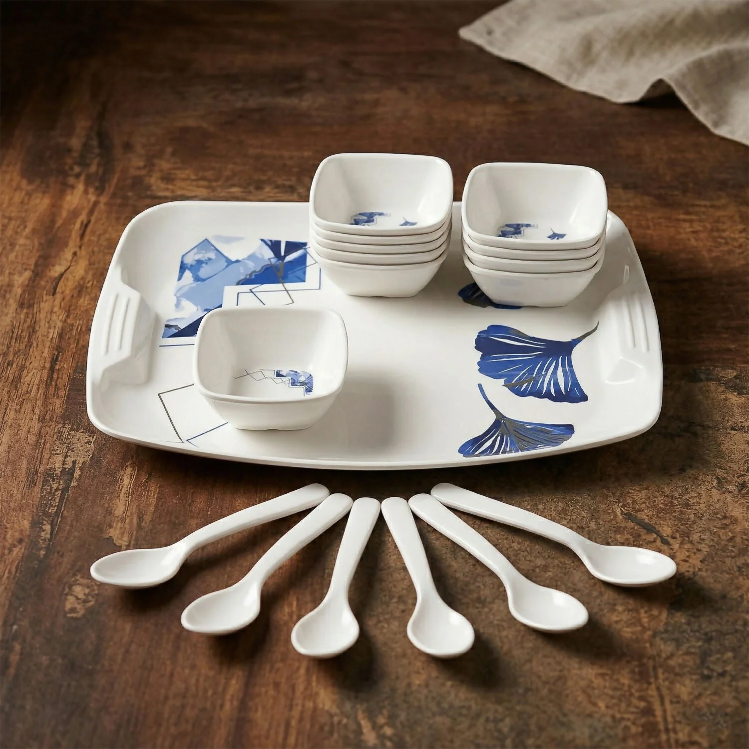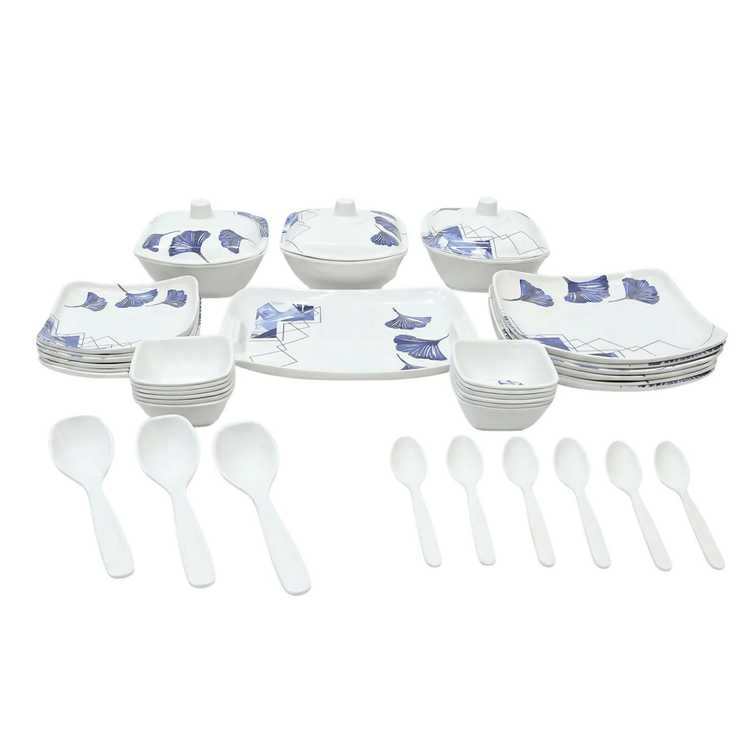 Upgrade your kitchen aesthetic with the Kalmia Prime Series. This premium dinner set combines elegance with extreme durability. Featuring a beautiful blue floral leaf motif on a crisp white square base, it’s designed to impress your guests and handle daily use with ease.