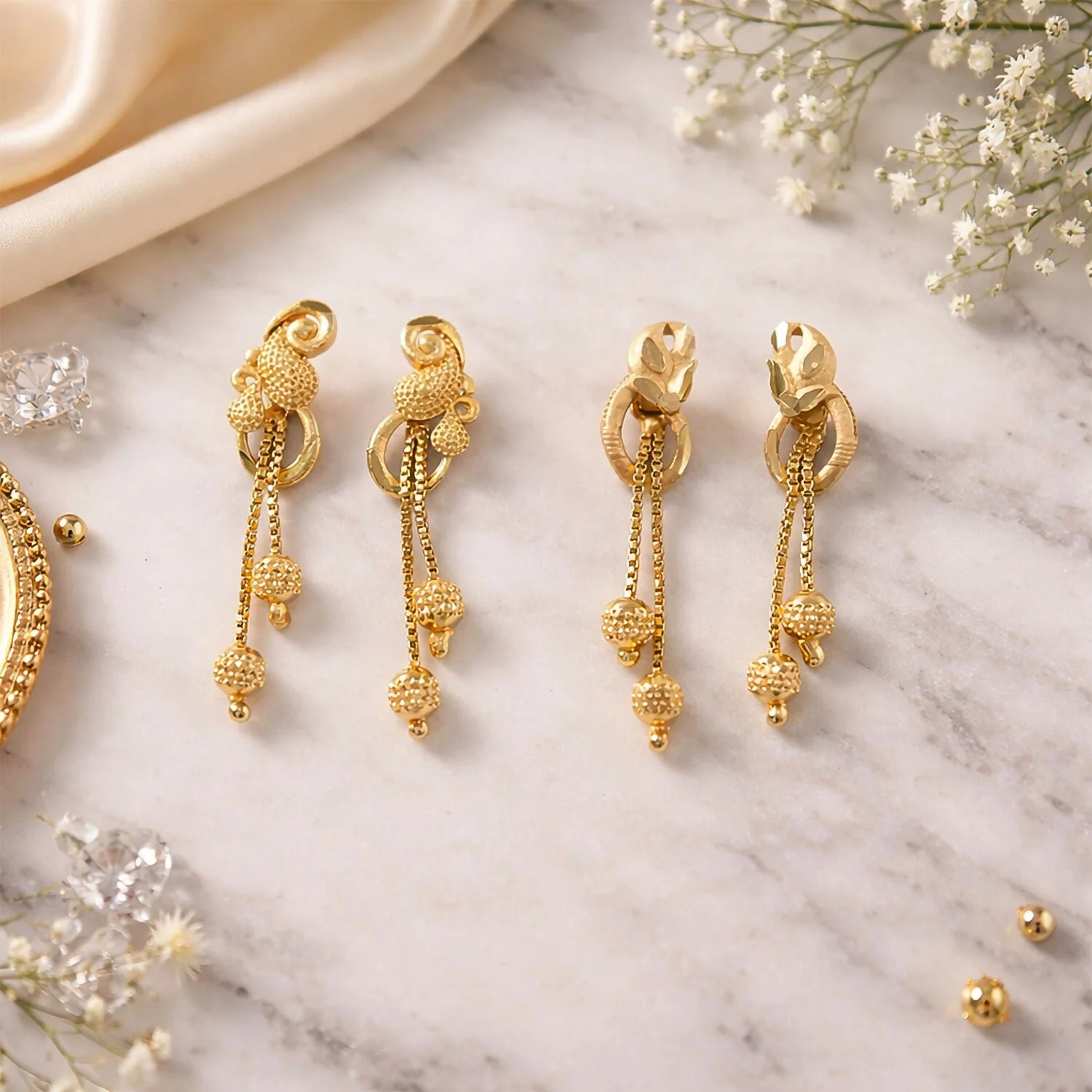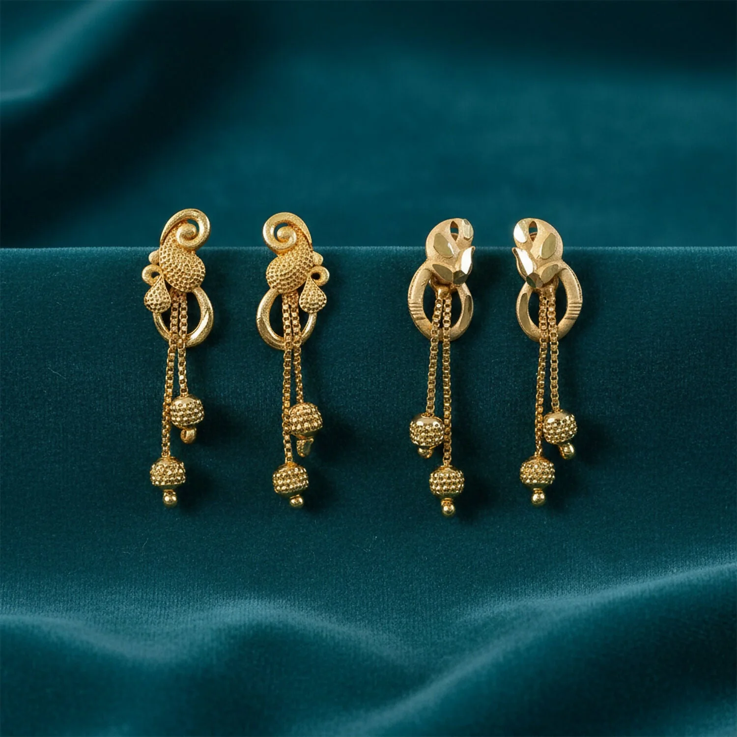 The decorative top connects to a smooth circular accent that gracefully supports three delicate gold chains. Each chain ends with finely textured bead drops that add subtle sparkle and movement. As the earrings sway with every step, the cascading chains catch the light beautifully, creating a soft shimmering effect that enhances their overall elegance.