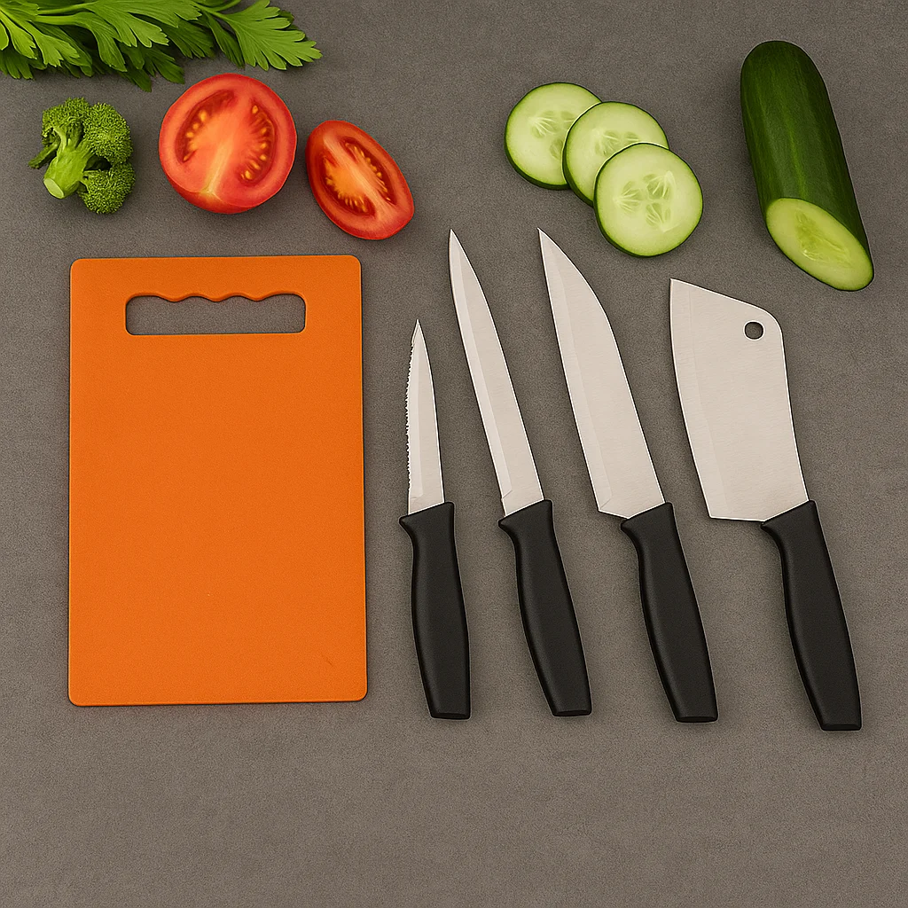 kitchen knife board set is a set of Five pieces that includes Three knives and 1 Butcher Knife.