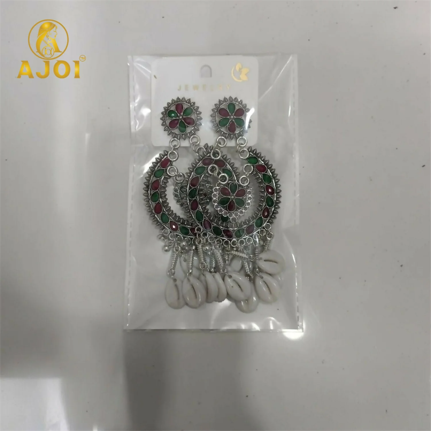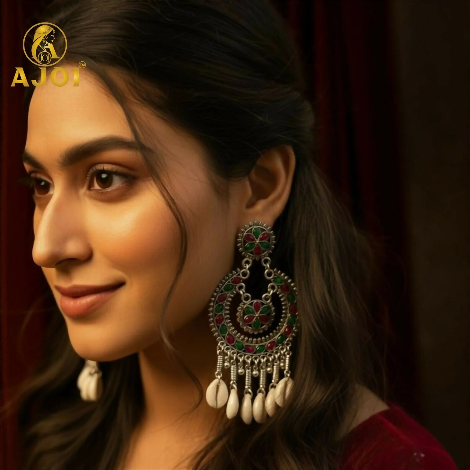 These stunning earrings are a perfect blend of traditional artistry and graceful design, crafted to elevate any ethnic ensemble with effortless beauty. The oxidised silver body is adorned with striking red and green floral Meenakari work, giving the jewellery a rich heritage appeal. The layered crescent detailing enhances the elegance, while the bottom features white dangling sea shells, adding a unique boho fusion twist to the traditional design.