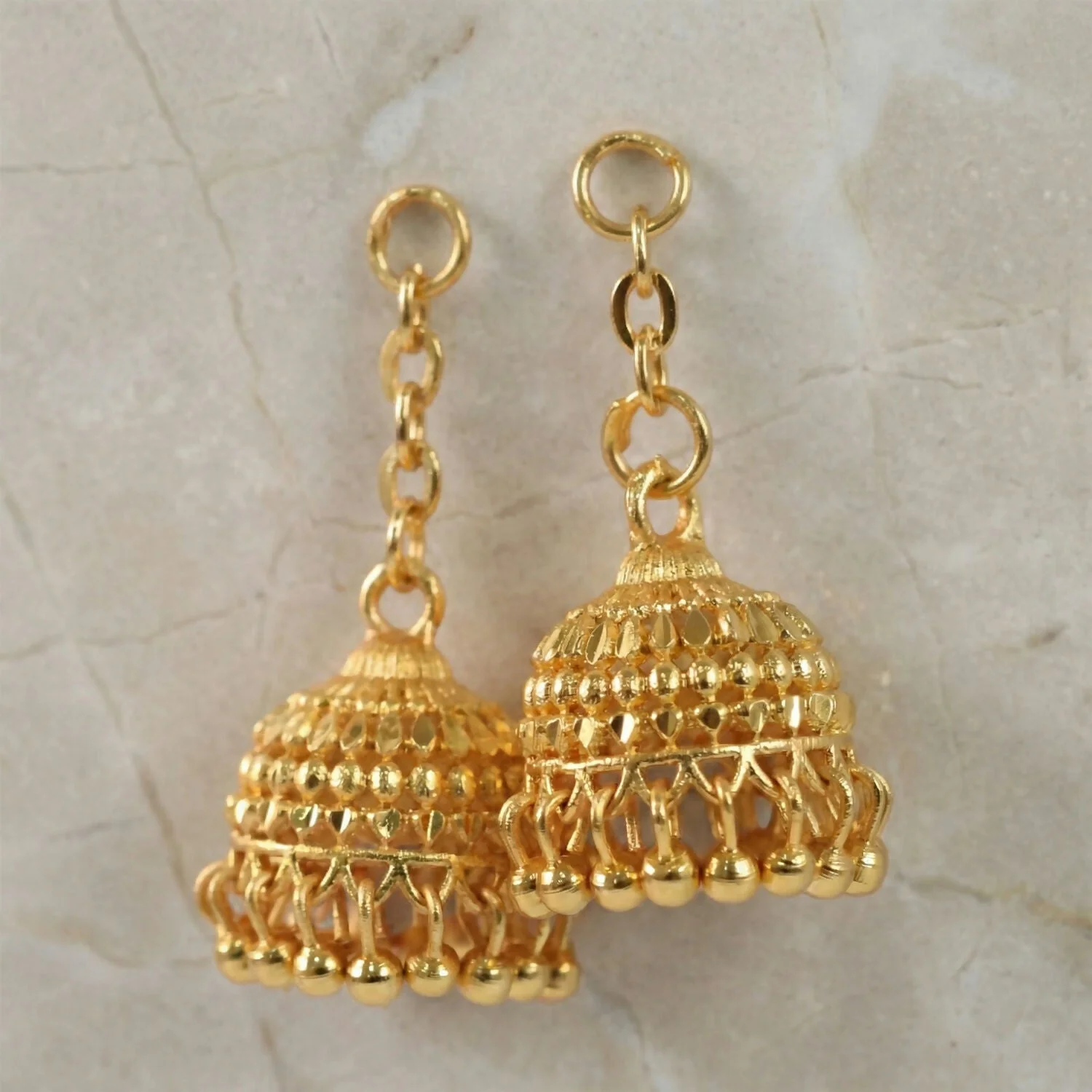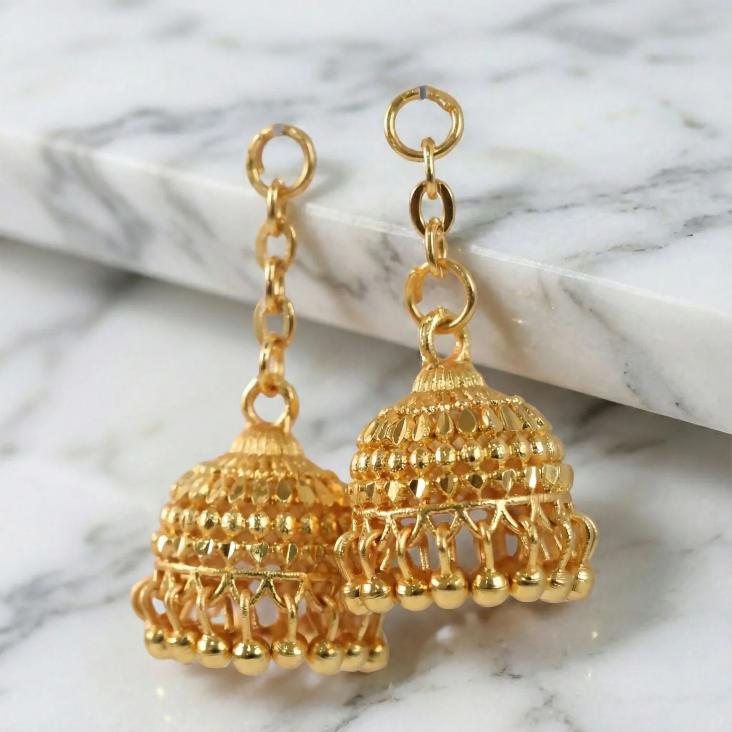 This classic jhumka features a beautifully layered dome design highlighted with fine cutwork and neatly arranged bead detailing along the edges. The rich gold-finish gives it a traditional and graceful appearance, making it suitable for festive wear and cultural occasions. The extended chain-style top adds elegance and balance to the overall look. Designed with intricate craftsmanship, this jhumka reflects timeless ethnic charm. A versatile traditional accessory that enhances both ethnic and fusion attire effortlessly.