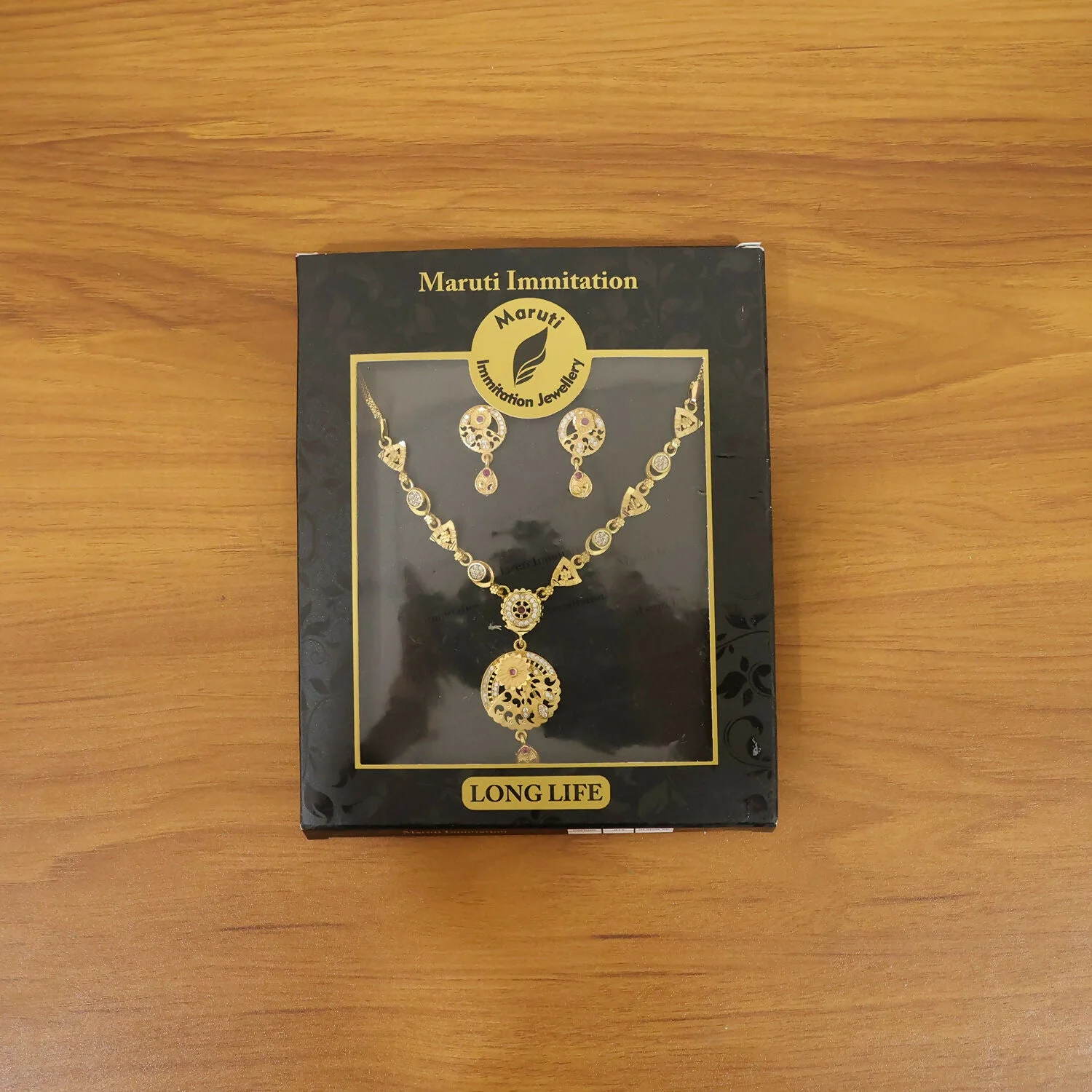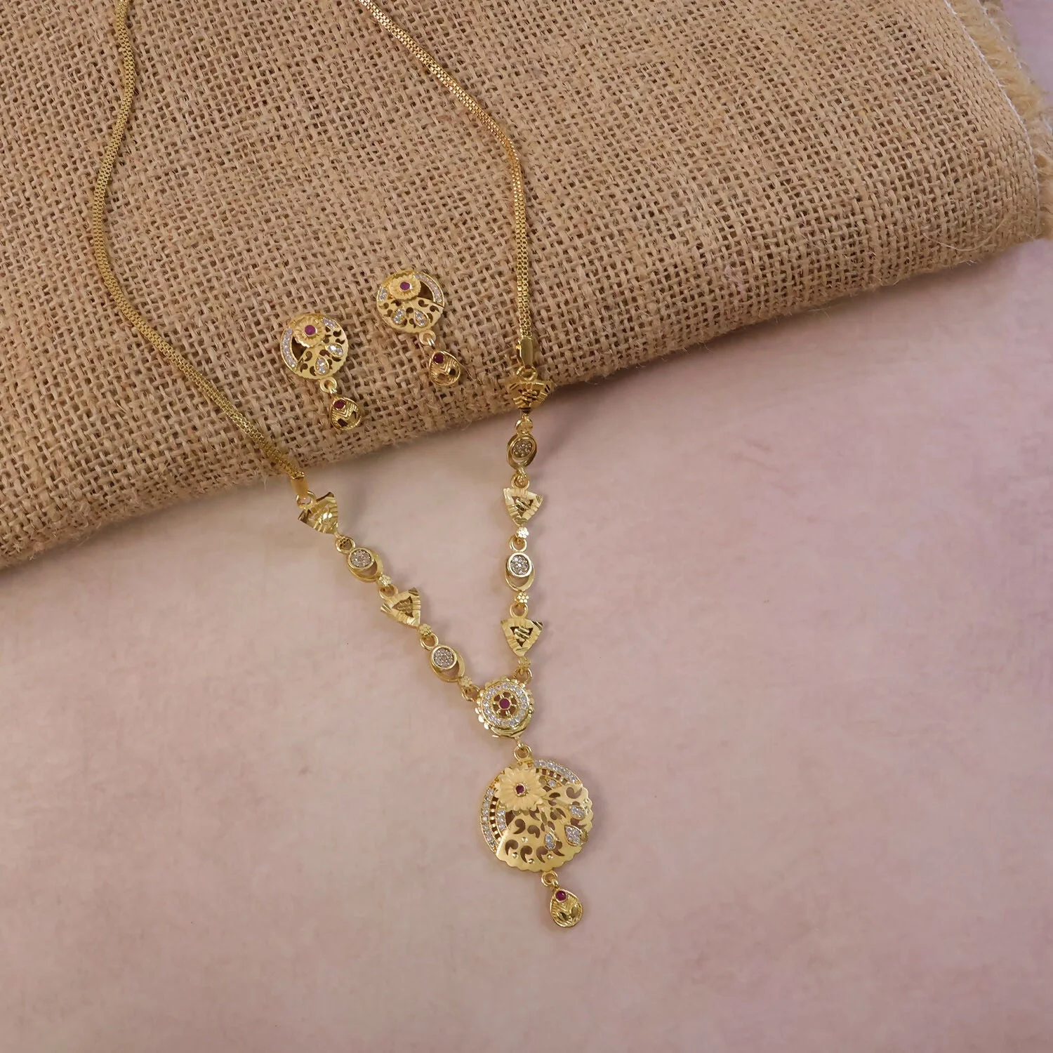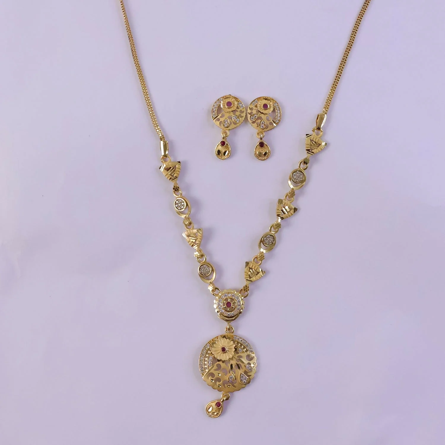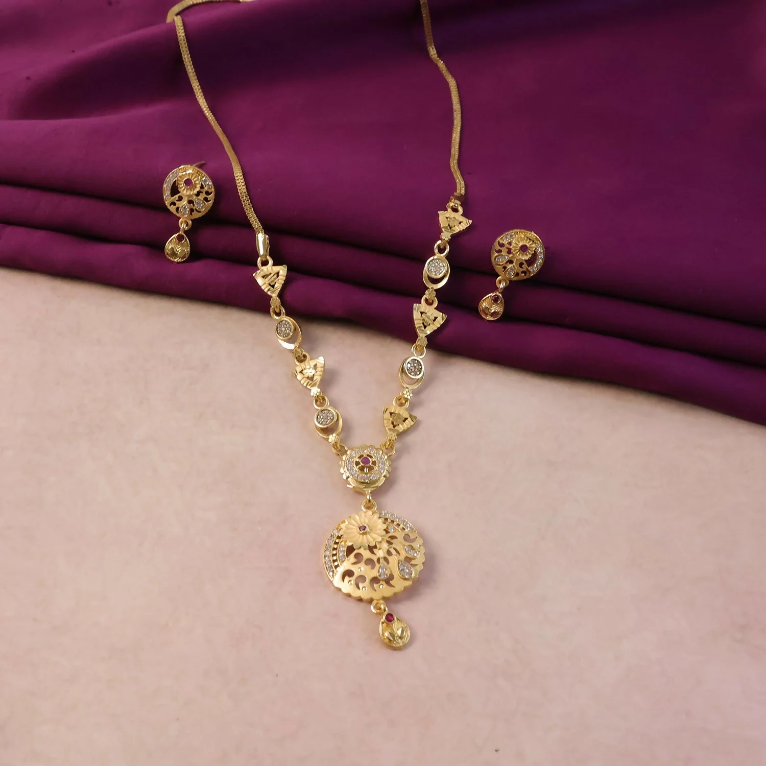 Be the first to review Classic Gold-Tone Floral Engraved Pendant Necklace Set with Designer Stud Earrings!