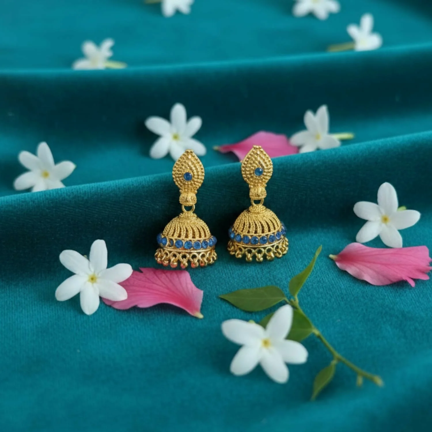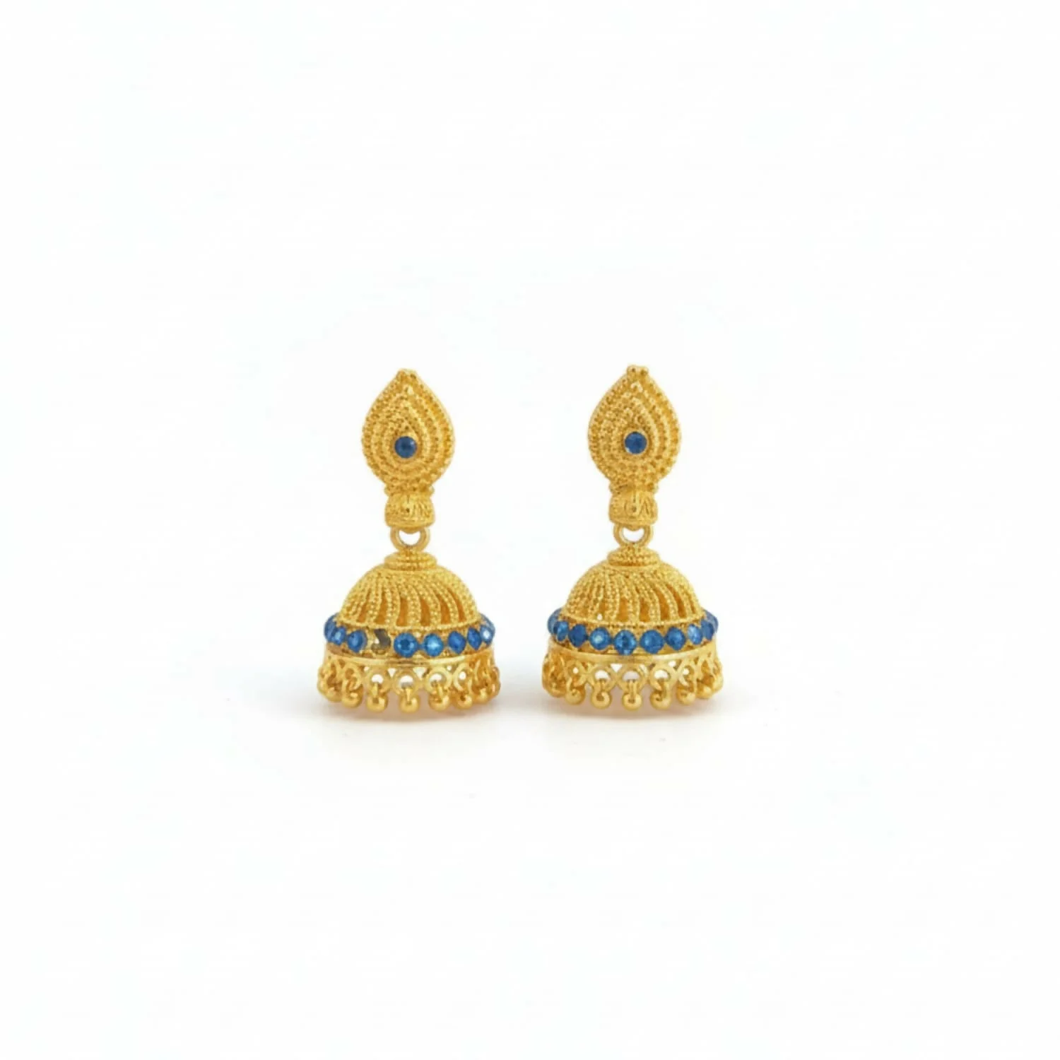 Elevate your ethnic wardrobe with these exquisitely crafted Gold-Plated Jhumka Earrings, featuring intricate filigree work and a classic bell-shaped drop. The ornate circular studs are accented with vibrant green and blue enamel touches, adding a regal pop of color to the traditional design. Finished with delicate golden beads that offer a graceful sway, these lightweight yet stunning earrings are the perfect statement piece for weddings, festivals, and special celebrations.