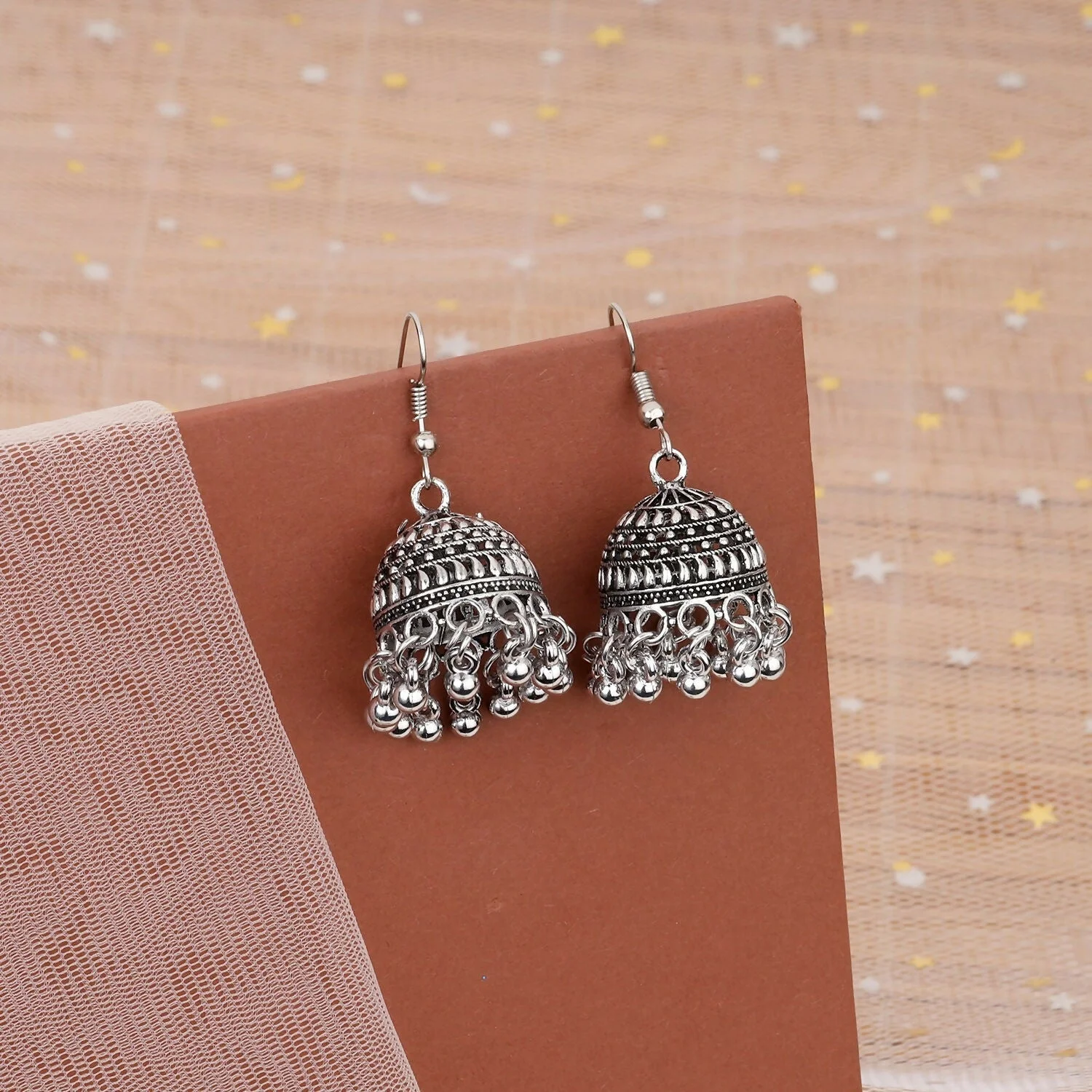 Enhance your ethnic look with these timeless oxidised silver jhumka earrings, designed with intricate dome detailing and delicate ghungroo danglers that add graceful movement and charm. The antique silver finish gives these jhumkas a rich traditional appeal while remaining elegant and versatile.