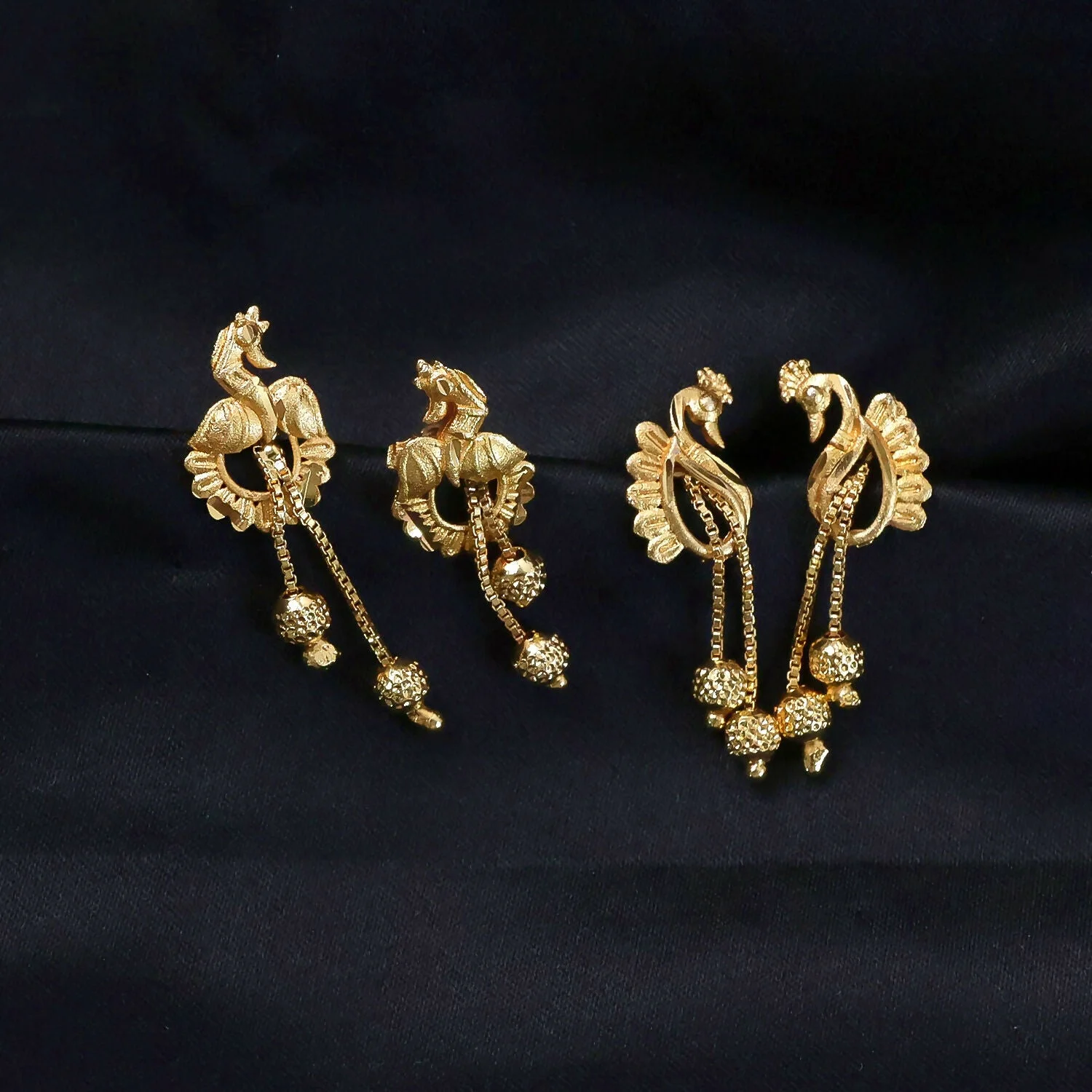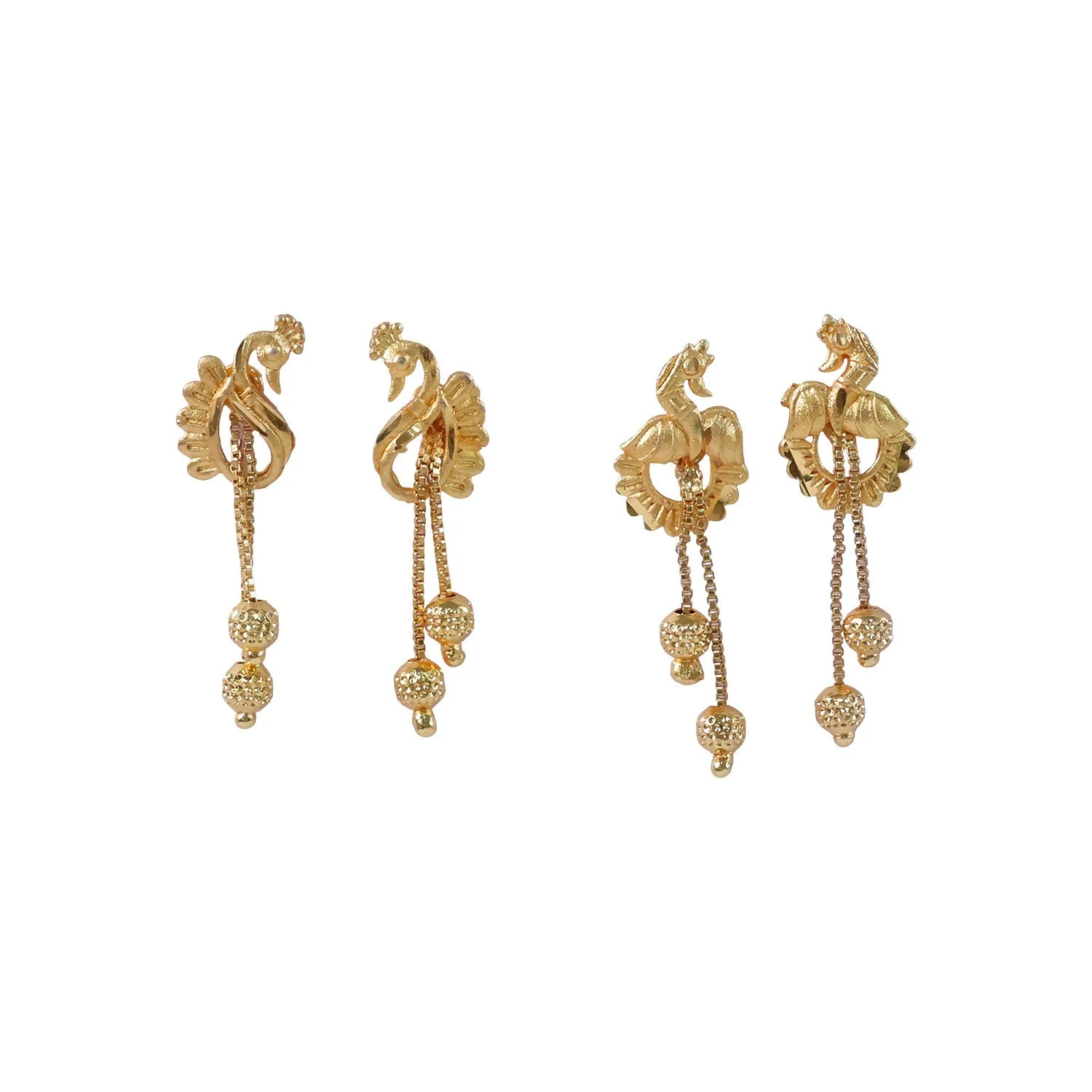 This combo includes two pairs of uniquely designed peacock-style dangling earrings, each showcasing artistic detailing and a rich gold-tone finish. The elegant drop chains with textured beads add a sophisticated touch, giving the earrings a luxurious and eye-catching look. Their traditional yet versatile design makes them perfect for pairing with ethnic outfits such as sarees, lehengas, salwar suits, and even modern fusion wear.