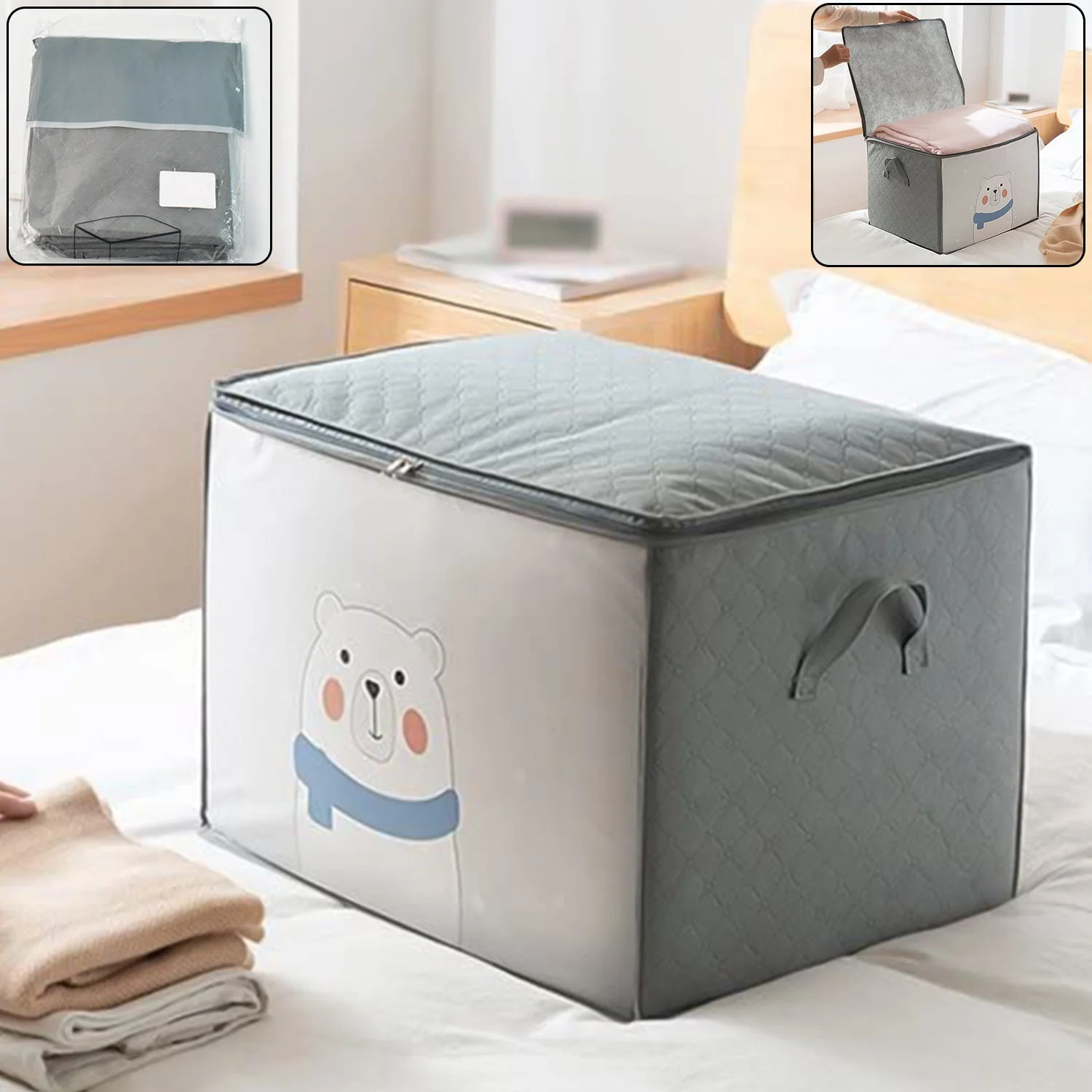 Premium Foldable Quilt and Clothes Storage Bag with Zipper & Handles – Cute Cartoon Design – Large Capacity Organizer for Bedding, Sarees, and Garments (1 Pc)