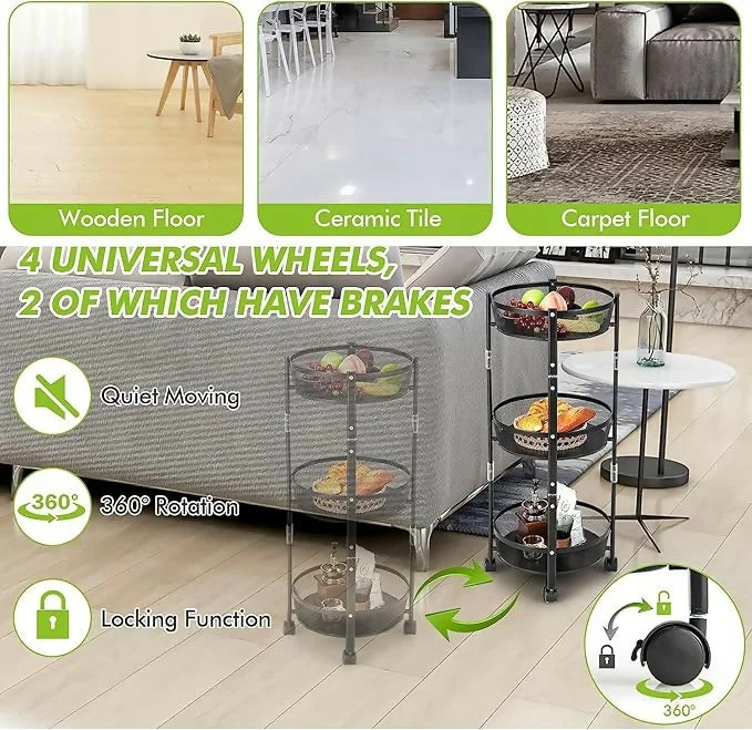 Its collapsible foldable design saves space when not in use, while the 3 large ventilated baskets ensure proper air circulation to keep your produce fresh and moisture-free. Designed with 360° smooth-rolling wheels, it can be moved easily across the kitchen, dining room, pantry, or even the office.