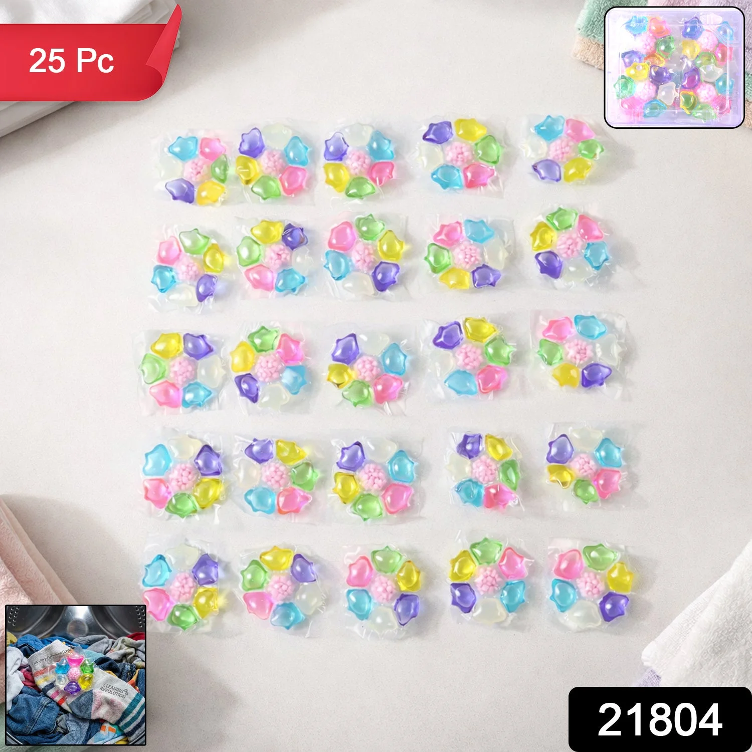 Colorful Laundry Detergent Pods (25 Pc) make laundry simple with pre-measured cleaning capsules designed for powerful washing. These color laundry pods dissolve easily in water and function as effective multicolor detergent pods for daily clothing care.