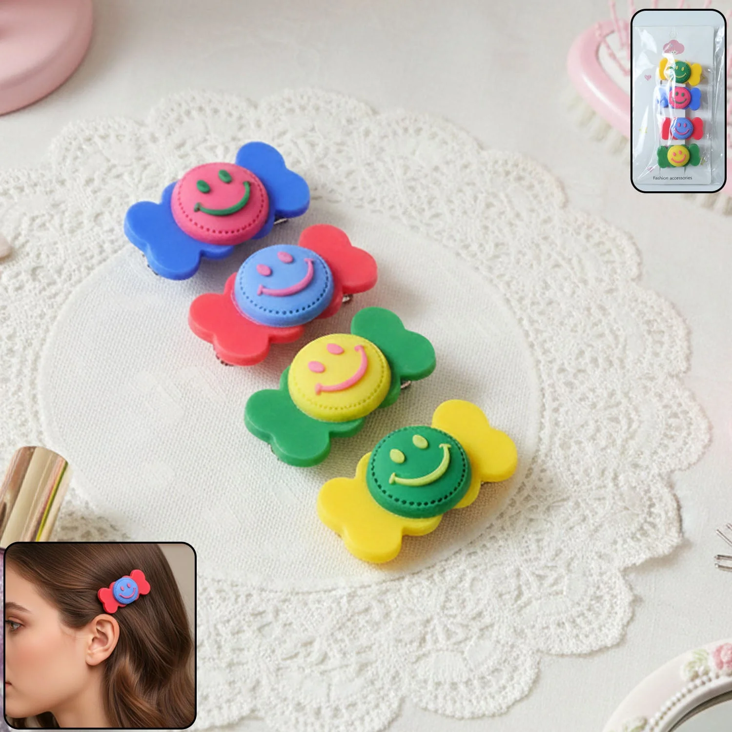 colorful smiley hair clips, candy design hair clips, decorative hair clip set, hair clips for girls and women, cute daily wear hair accessories, smiley face hair clips, playful candy hair clips, fashion hair accessories, trendy cute hair clips, snap hair clips set, decorative hair pins, everyday styling hair clips, fun cartoon hair accessories