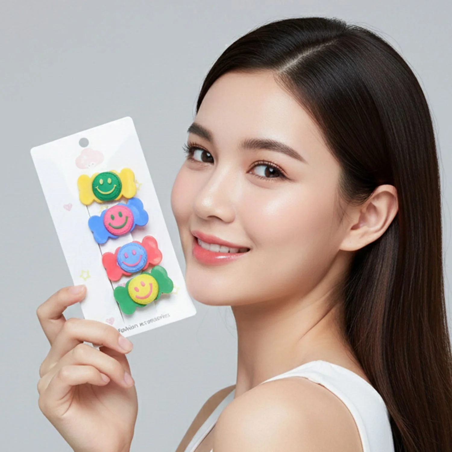 This decorative hair clip set features a cheerful smiley face with a candy-inspired design that adds a playful charm to everyday hairstyles. Designed for easy and secure use, these clips help keep hair neatly in place while enhancing the overall look. The smooth surface and lightweight structure ensure comfortable wear without causing hair pulling or discomfort. Ideal for daily grooming, these clips bring a fun and trendy touch to casual styling. A perfect addition to any hair accessory collection.