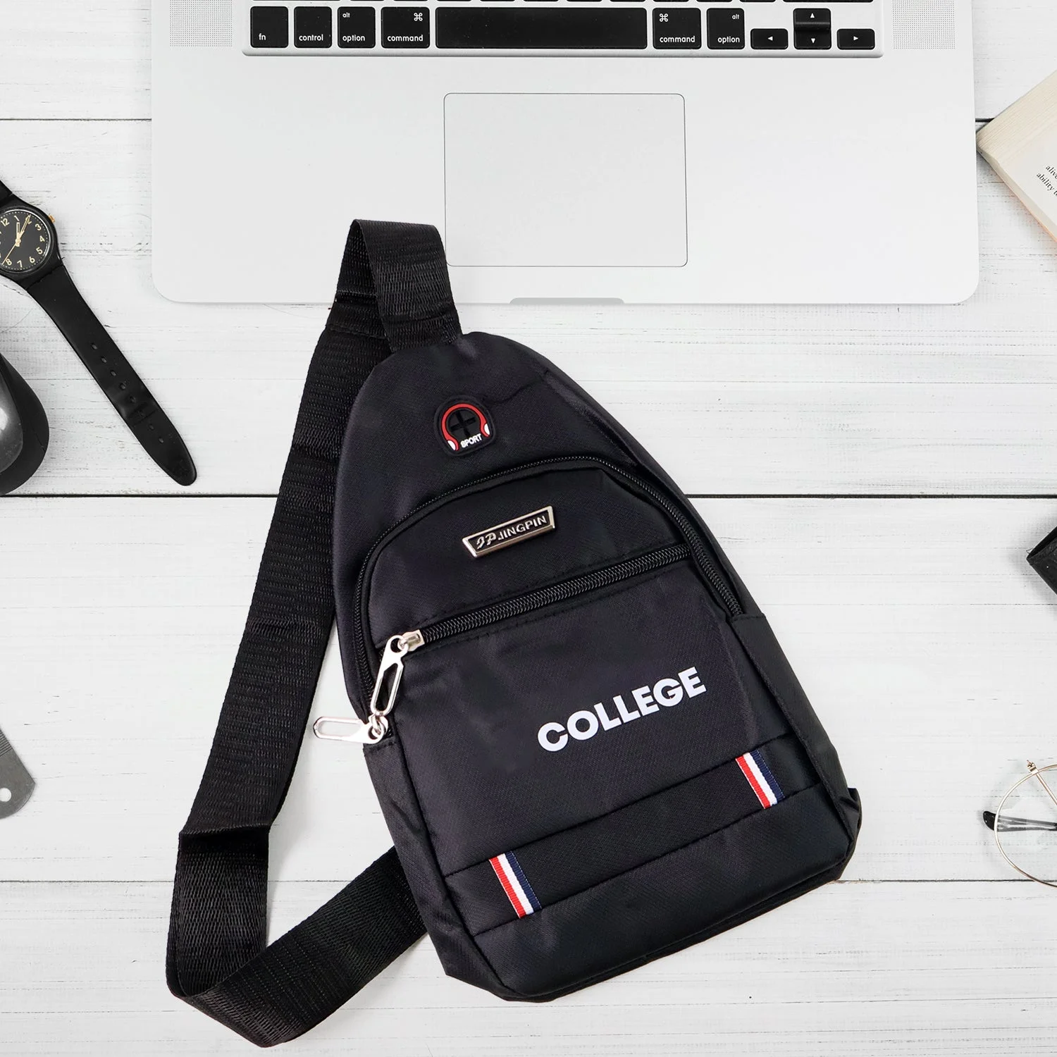 This multipurpose crossbody sling bag is designed for everyday convenience, whether for college, travel, or casual outings. Compact in size but spacious enough for daily essentials, it features a durable zipper closure, front and main compartments, and an external headphone port for hassle-free audio access. Its sleek black design with "COLLEGE" branding and adjustable strap makes it a modern utility accessory for students and commuters alike.