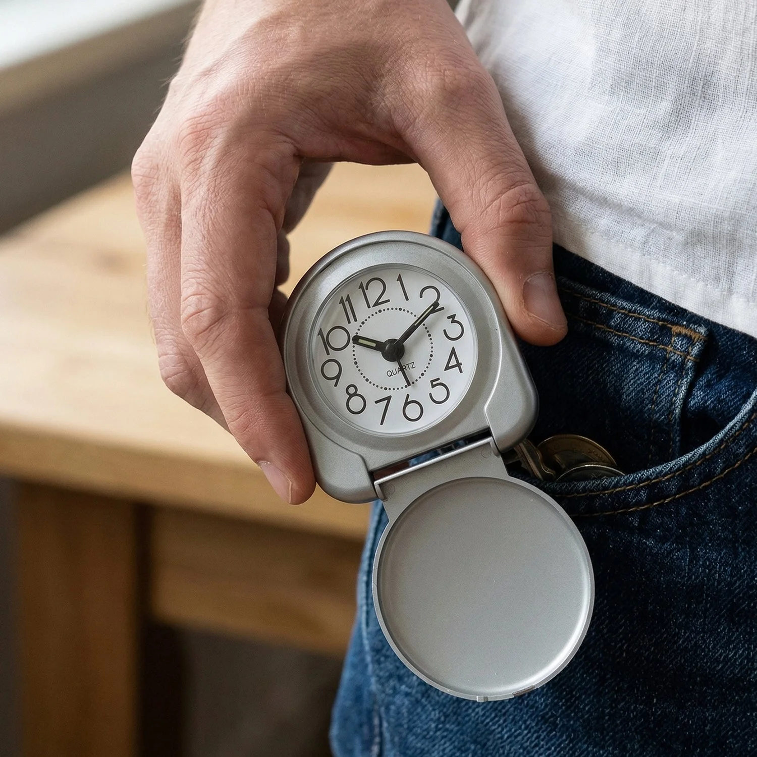 Stay punctual wherever you go with this compact foldable travel alarm clock designed for convenience and reliability. Featuring a smart flip cover design, it protects the clock face while making it easy to carry during travel. The clear analog display ensures easy time reading, while the precise quartz movement provides accurate timekeeping. Its lightweight and portable design make it perfect for bedside tables, office desks, or travel bags. Ideal for those who prefer a simple, classic alarm clock with dependable performance.