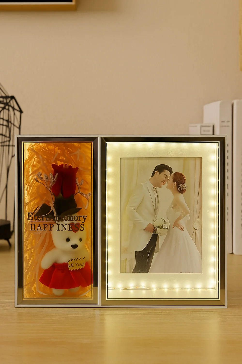 Celebrate your cherished moments with this elegant dual-sided LED photo frame. One side features a romantic wedding photo space illuminated by soft LED lights, while the other side includes a cute teddy bear, a red rose, and the message "Eternal Memory Happiness." Perfect as a wedding gift, anniversary present, or home decor accent. Made with premium materials for a polished, modern look, this frame adds a heartfelt touch to any setting.