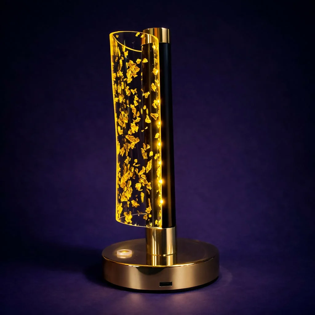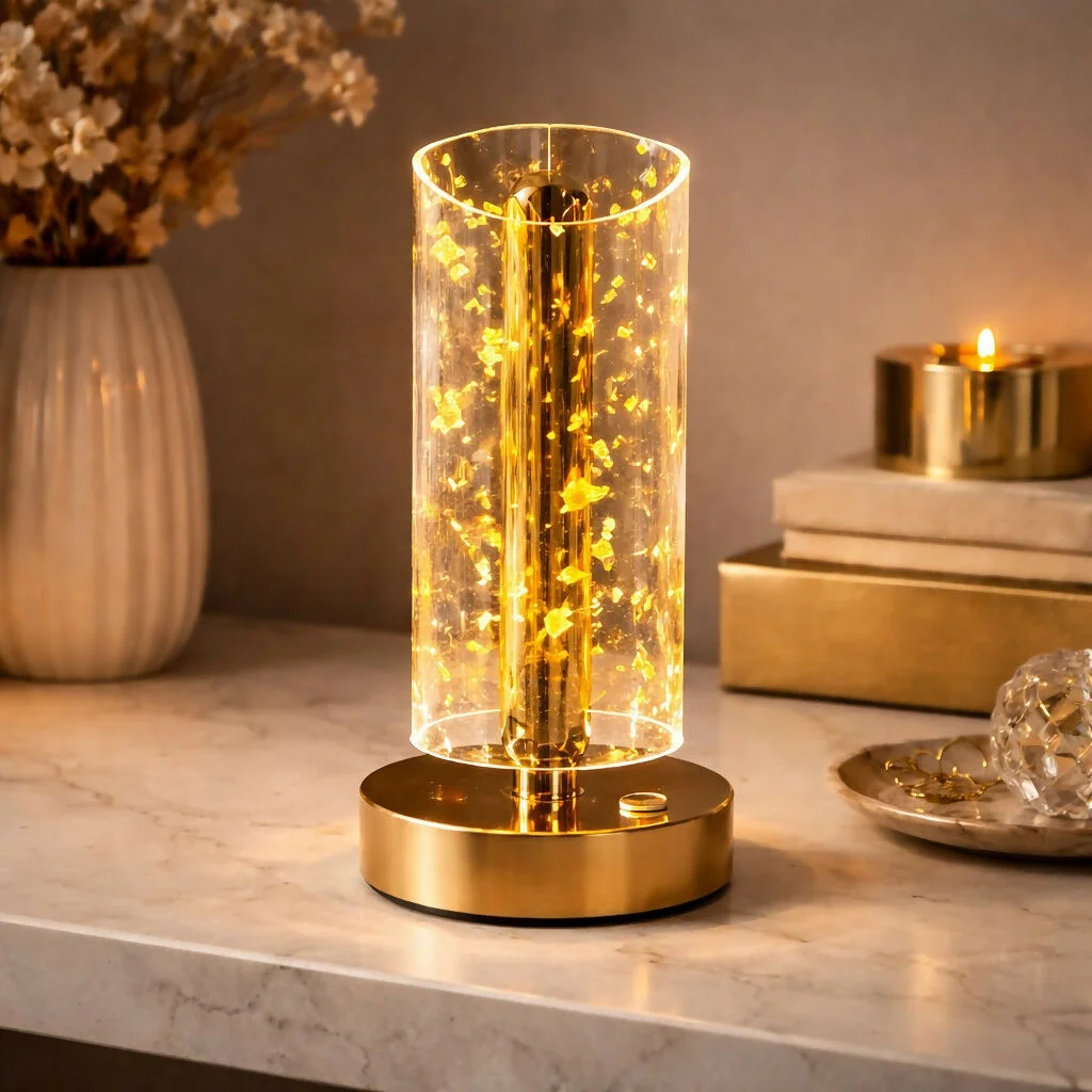 Add a touch of luxury to your space with this crystal glow LED table lamp. Featuring a stunning transparent shade with glowing crystal-like flakes and a premium gold base, this lamp creates a warm and mesmerizing ambiance. Perfect for bedrooms, living rooms, or work desks, it enhances both lighting and decor. Its modern design makes it an eye-catching centerpiece and a great gifting option.
